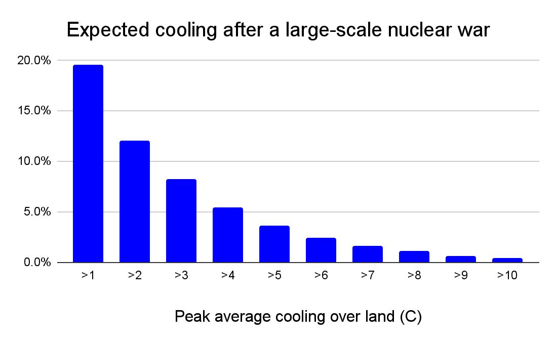 - I find that 20% of large-scale nuclear conflicts cause at least 1°C of cooling over land and 1% lead to at least 4°C of cooling.