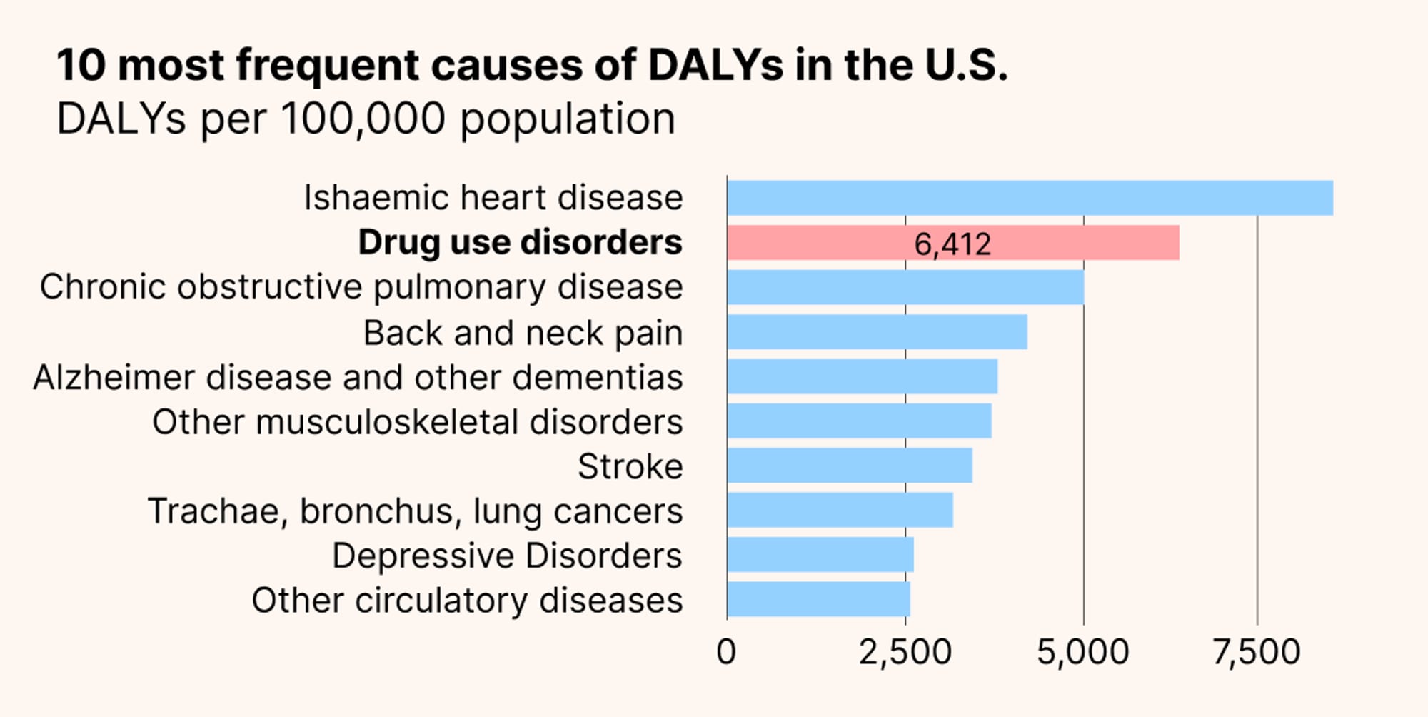 This comes right from the WHO DALY dashboard for the USA. But this does not include alcohol or cigarettes in ‘drug use’ and it also breaks up cancers and heart diseases into various subcategories. I’m pretty sure that addiction, if you include alcohol and cigarettes (and subtracting those from heart disease and cancer), would be at the top of DALYs in the US even after grouping together heart diseases and cancers. It would be great to have a method for this.