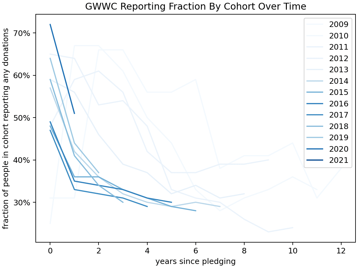 We include a table “Proportion of GWWC Pledgers who record any donations by Pledge year (per cohort)” on page 48. In sum: reporting declines in the years after the Pledge, but that decline seems to plateau at a reporting rate of ~30% .