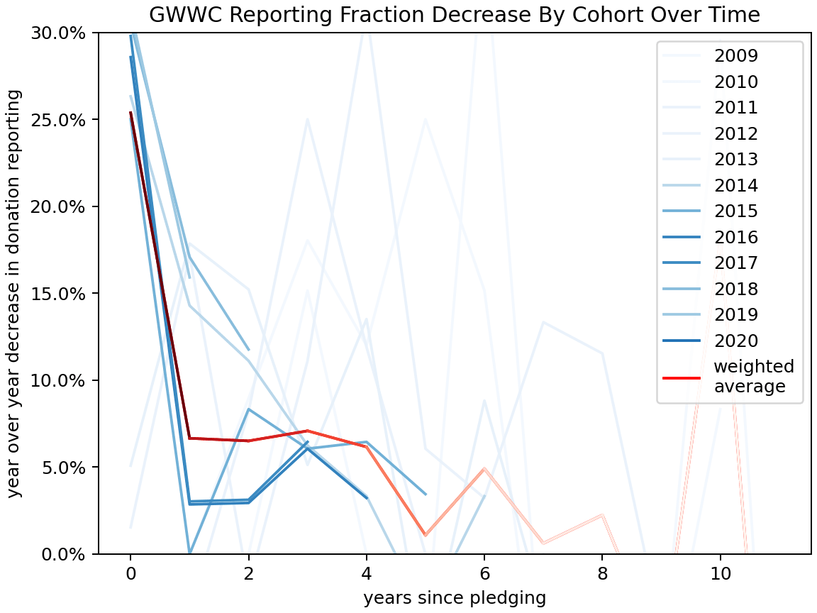 Looking at the chart, it's clear that decay slows down over time, and maybe it slows enough that it's fine to ignore it, but it doesn't look like it goes to zero. A cohort-size-weighted average year/year decay where we ignore the first six years (starting with 5y since pledging, and so ignoring all cohorts since 2015) is 2%.
