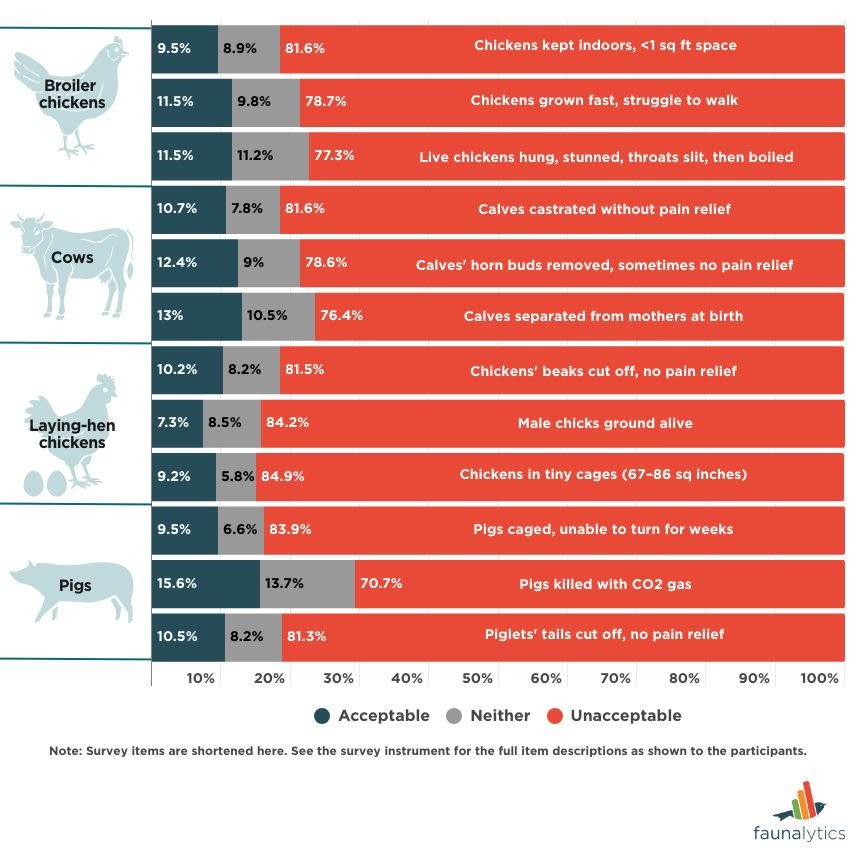 - A clear majority of the U.S. public finds standard animal agriculture practices for pigs, cows, and chickens to be unacceptable, ranging from 71% to 85%, depending on the practice. Indeed, only a minority of people found standard practices to be acceptable, ranging from 7% to 16%.