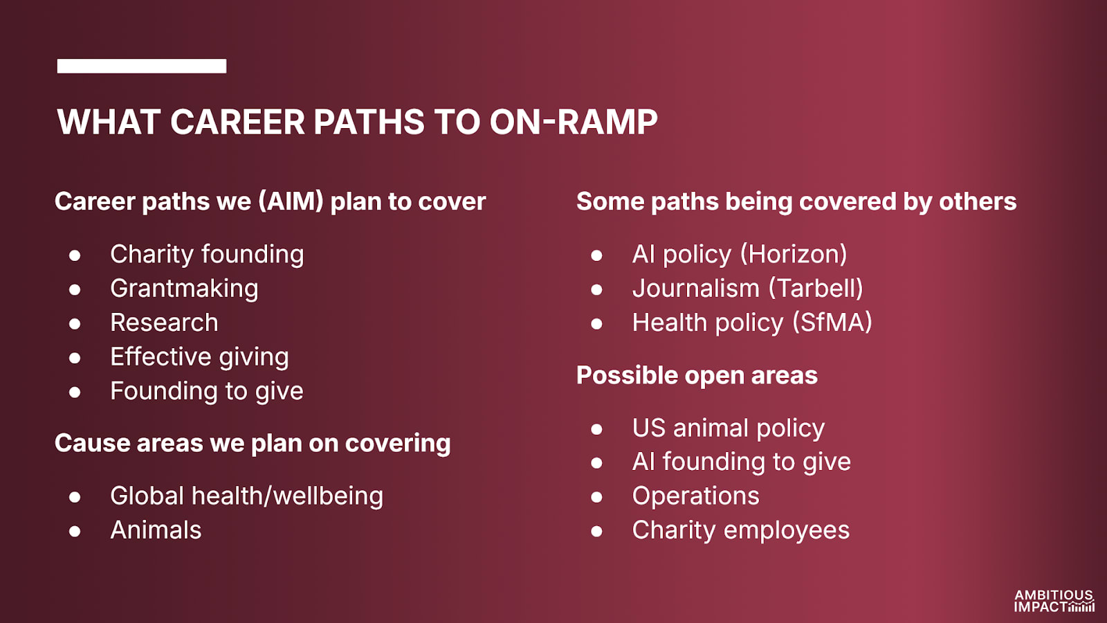 Executive summary: Ambitious Impact (AIM) is expanding its programs to create more "on-ramps" for high-impact careers, aiming to help talented individuals overcome final barriers and enter impactful roles across multiple fields.