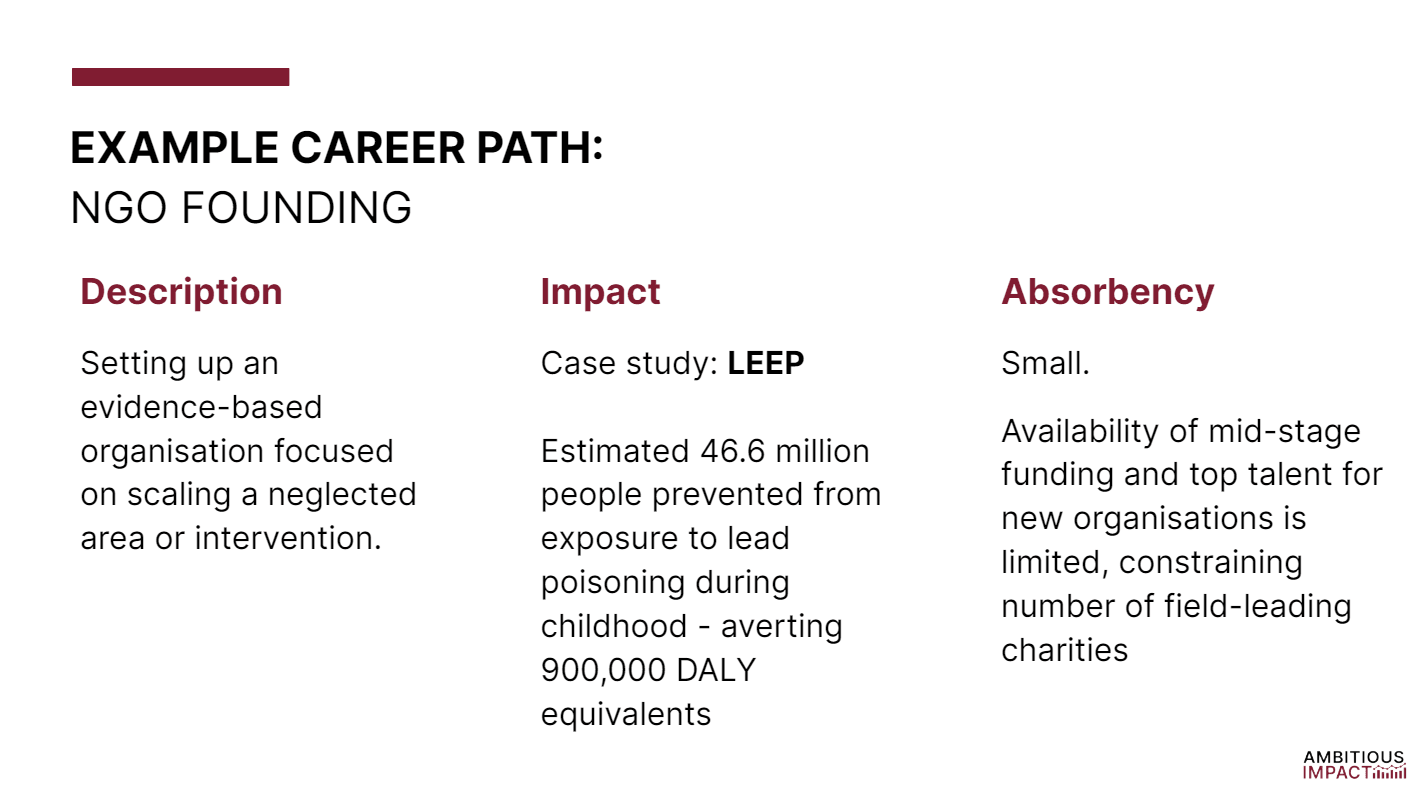 A weakness of this career path is the absorbency is small. At the end of the day, there's a lot of things that affect how many charities we can actually found beyond the number of founders and people going into the career path. There's funding limitations, there's other talent limitations to building up the ecosystem. There's even idea limitations about how many ideas are out there that are particularly cost effective and conducive for a brand-new charitable organization to start.
