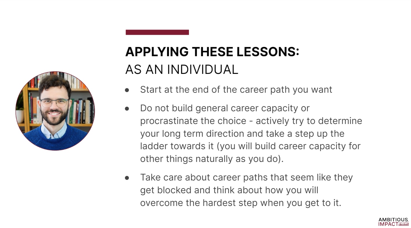 This is actually a bit of counter advice to what you often hear in the EA. I'm a little less excited about building general career capacity or procrastinating your career choice. I know that many people want to procrastinate career choice; it's a big, scary thing, and it just feels a bit safer and easier to go get a PhD and think about it four years from now. But if you actually have a destination in mind, you're able to get there a heck of a lot faster. And you will build career capacity for other things along the way; it's not like these careers are all in a vacuum, moving a step up on one career path often helps you move up a step on another career path. Consider mapping out the space, actively trying to determine your long term direction, and think about how to build up the ladder.