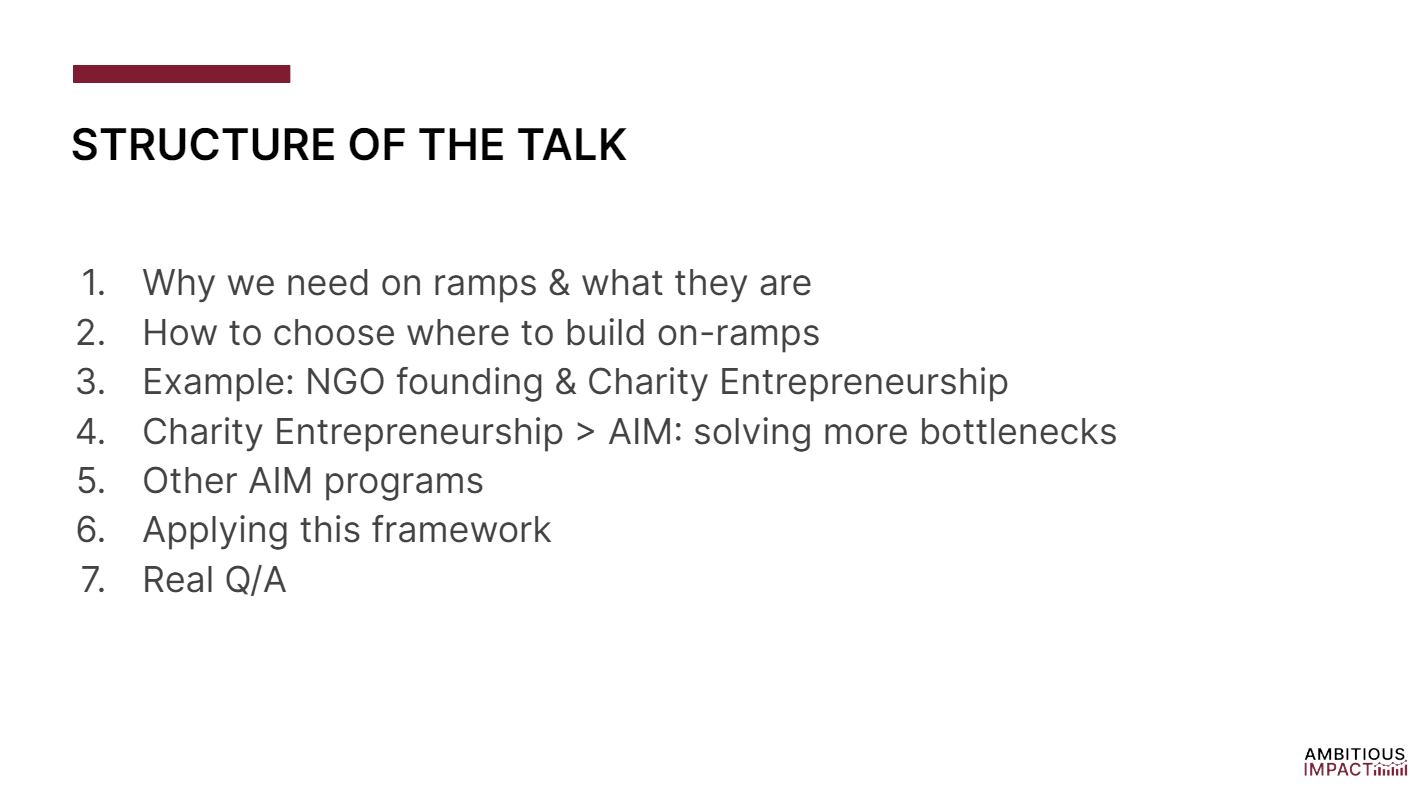 In this talk I'm going to talk briefly about on-ramps; what they are, why we need them, and why they're valuable. Then I’ll talk about a few concrete examples, specifically what Ambitious Impact is doing as well as some gaps of where I think other on-ramps can be created for high impact career paths. Then, we'll talk about applying this framework a bit more broadly to the world; what to do if you’re an individual, what to do if you're associated with an EA organization, and what to do as a movement to make this whole thing result in more people having high impact career paths.