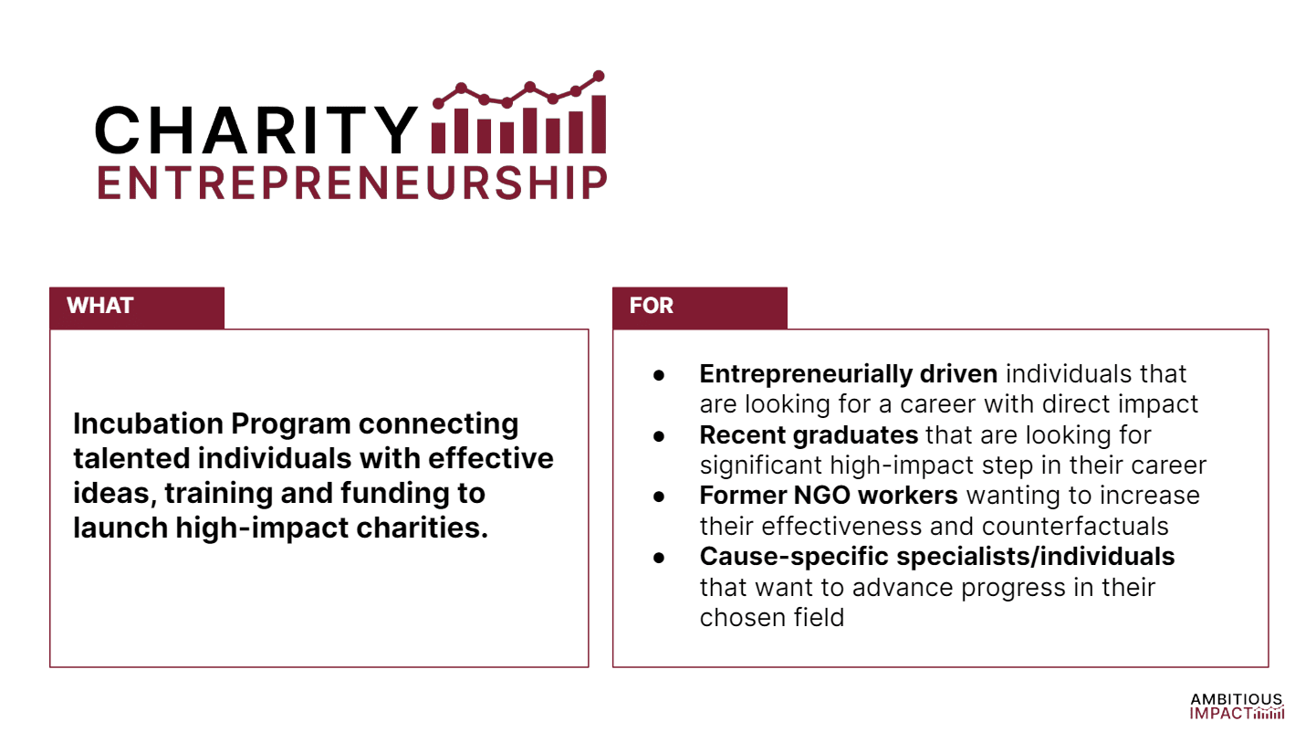 Ambitious impact is more encompassing, aimed at how to in general find and build on-ramps to multiple high impact career paths, not just charity entrepreneurship.