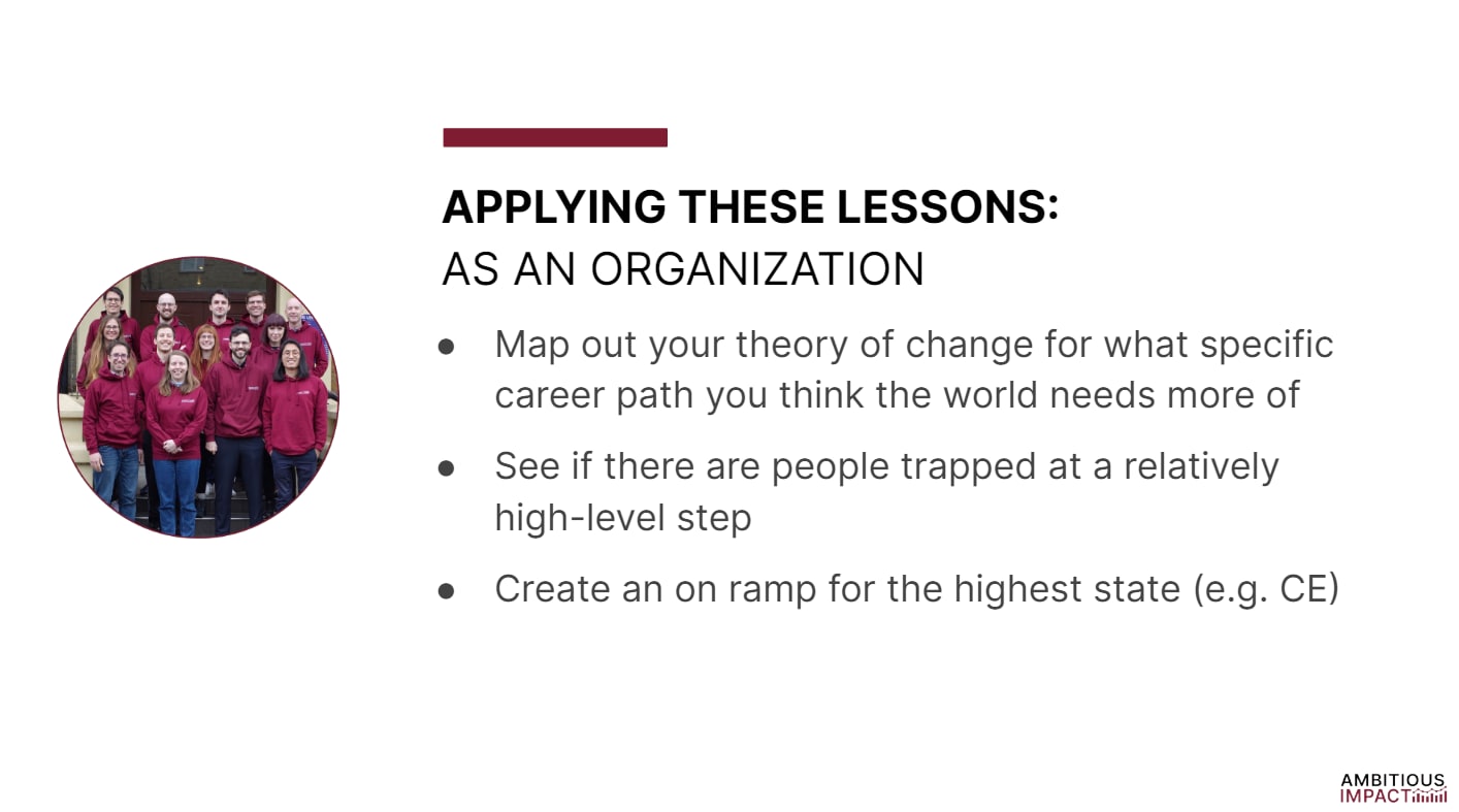 Let's apply these lessons as an organization. Many of you probably work for organizations, and many of you probably work for EA organizations. That gives us a bit of extra responsibility to think about this from a broader, community level perspective. I think it's really useful to map out your theory of change for specific career paths. If you're training people, especially at an early stage, say you're running an EA chapter, where do you want these people to go eventually? What do you actually want them to do? Again, easy to procrastinate and say, “we'll just teach them some good stuff, and they'll figure it out.” I think that's cheating. I think we should actively think about what we're hoping to get out of our chapters, out of our early stage on-ramps, consider what kinds of paths we want to foster, even if there's multiple of them, even if it's a bit vague.