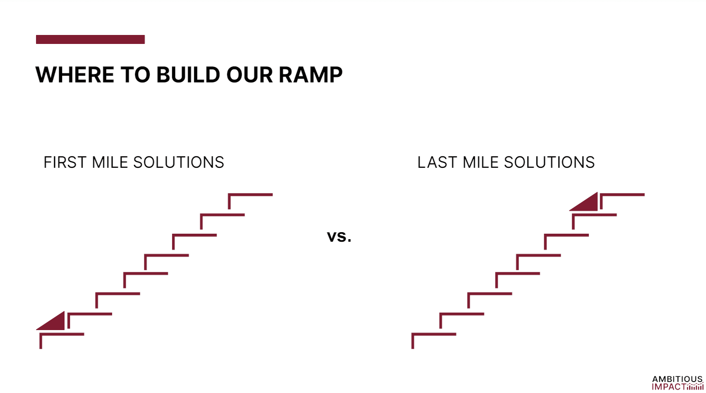 Interestingly, 95% of the way to being a great charity founder actually doesn't cause that much impact at all. So these last mile solutions are really important. This is in contrast to first mile solutions, which actually the EA movement historically has done a lot. Examples like EA outreach broadly, community chapters, these build up the base of people who eventually will hit these high impact career paths. But there's many, many steps left on the journey before they actually get there. You need a combination of both, but looking at the career ramp as a whole, I do think we're relatively under-invested in last mile solutions.