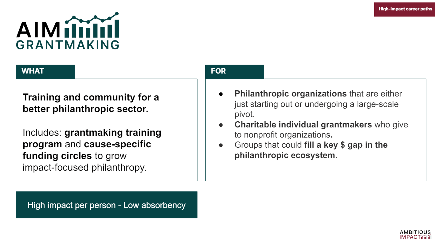 As a result, we set up this grant making program. It's a good fit for philanthropic organizations, individual grant makers, high-net-worths who all want to give more money effectively. You can already guess the problem with this though; extremely low absorbency. At the end of the day, there's not that many grantmakers who are just starting out and excited to change their pathway dramatically, or that many high-net-worths who are giving a bunch of money and want to fill key ecosystem gaps. This is a great place to build an on-ramp that helps absorb maybe 12 people a year.