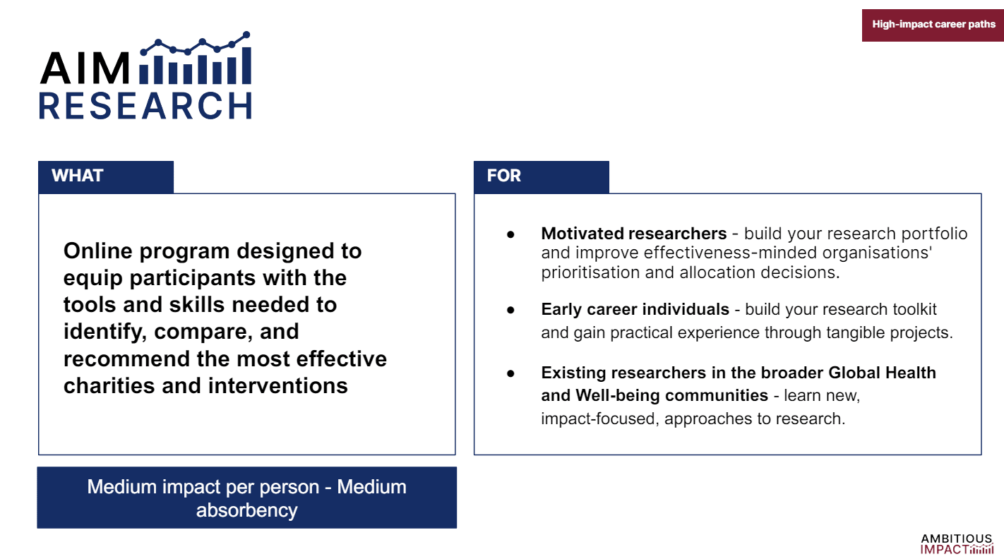 This program is aimed at motivated researchers who have already done some sort of research in their career, but want to jump to that next level; people who already have a bit of a knack and disposition, with the goal of widening their skill set, bringing them up to a level at which they can take that next step in their career path. It's good for early career researchers, people who are moving into a broader ecosystem than they were working in before, or moving from non-EA research to EA research. This path has medium impact and medium absorbency, although it depends on what research jobs you're looking at. If you're only looking at the top five EA organizations, then it's a smaller career path. If you're looking at the broader ecosystem stuff like Center for Global Development, or IPA, then it's a much wider set of organizations that are promising.