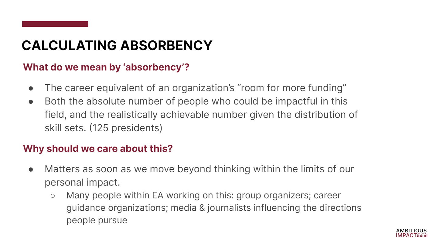 - Absorbency (i.e. the number of people who can realistically and successfully get a type of job) is an underappreciated consideration for EAs looking to build the spaces within which individuals can have an impact with their careers.
