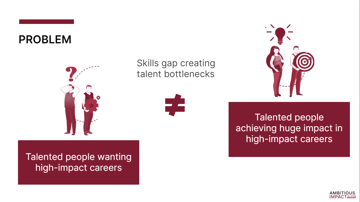 - The talk emphasizes the need for structured guidance to help people transition into high-impact careers, especially those who are already skilled but face last-mile barriers. Building on-ramps for people who are 95% of the way to impact is thus a uniquely effective way to solve talent bottlenecks.