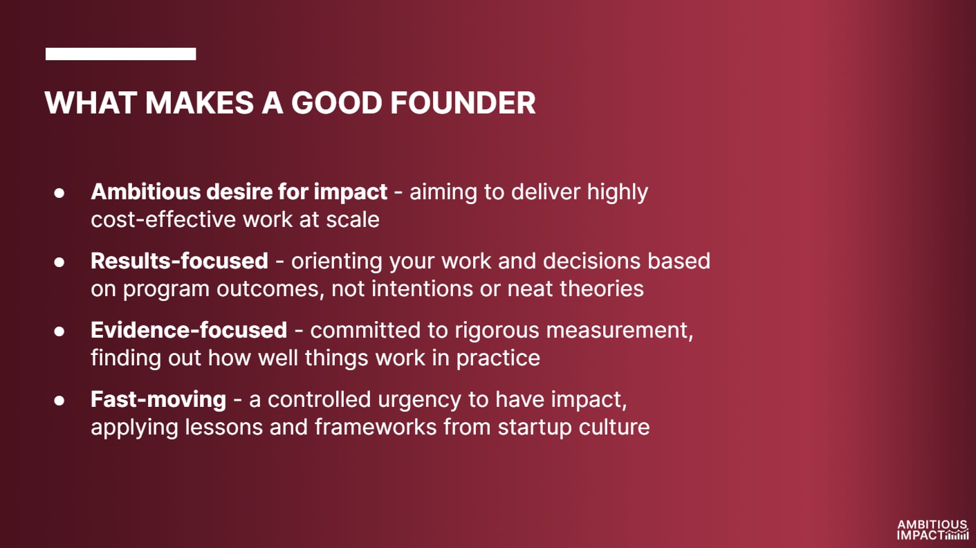 So we have the script for what makes a good founder, we know how to find the people, we know how to train them. We know that if someone's really ambitious, results-focused, evidence-based, fast-moving, if they have all these entrepreneurial driving traits, they can have a huge amount of impact in charity entrepreneurship. But fundamentally, there's still a lot of people that aren't doing charity entrepreneurship, or at least weren't doing charity entrepreneurship because of barriers.