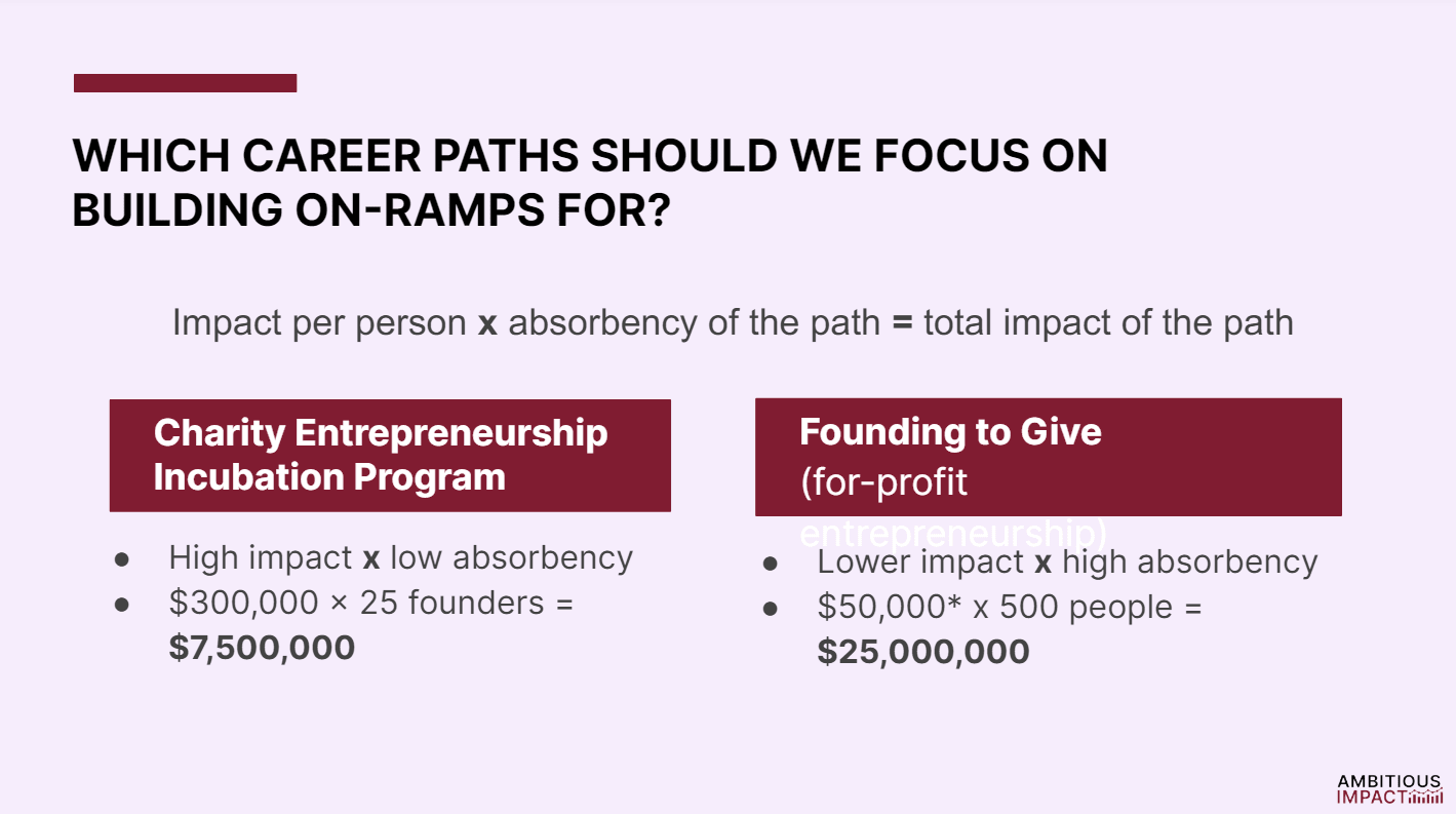 The first question we have to ask here is, what career paths do we actually want to focus on when it comes to building these on-ramps? We have a couple different factors that we can look at, some of which the EA movement already thinks about a lot, and some of which EA typically neglects. To model the total impact of a career path, you can think about the impact per person times the absorbency of the career path. The absorbency of the career path is the thing that I think categorically we tend to neglect or forget about. To illustrate this I’ll use two examples, Charity Entrepreneurship and Founding to Give.