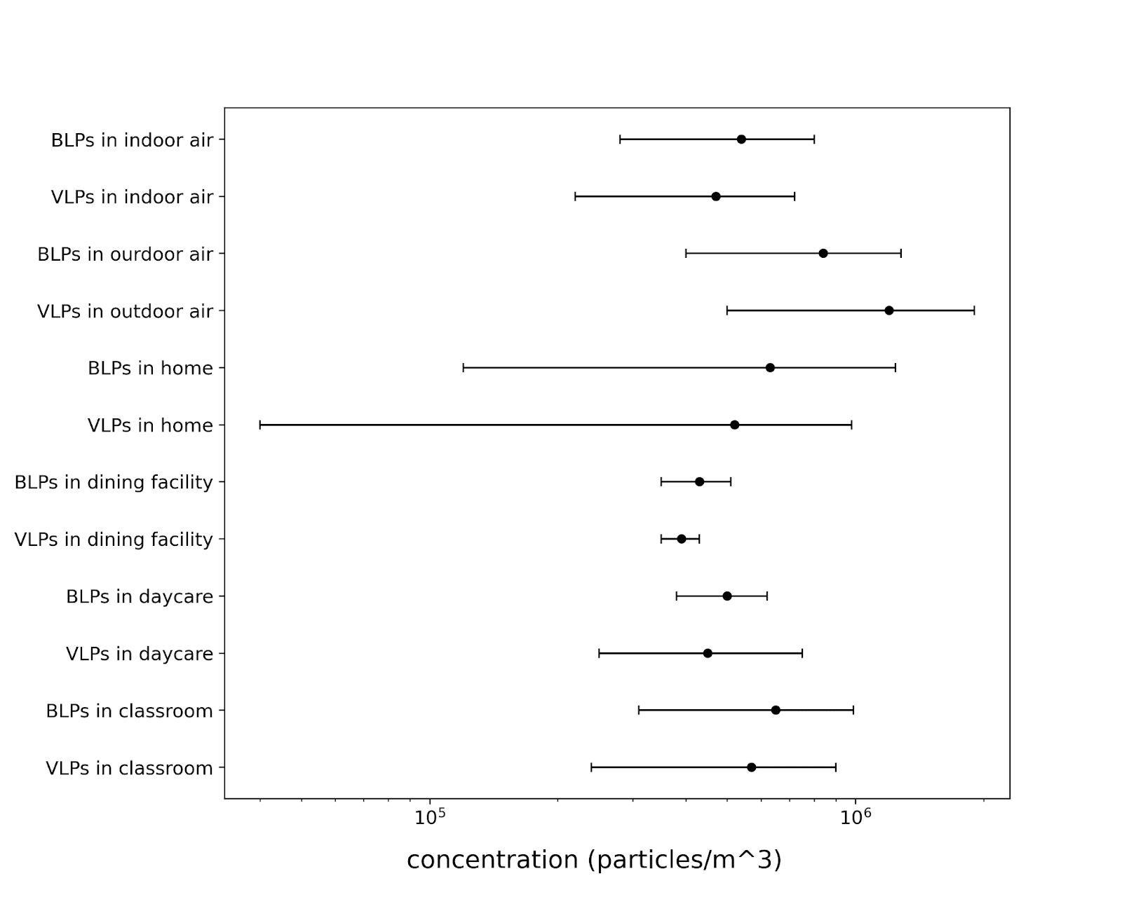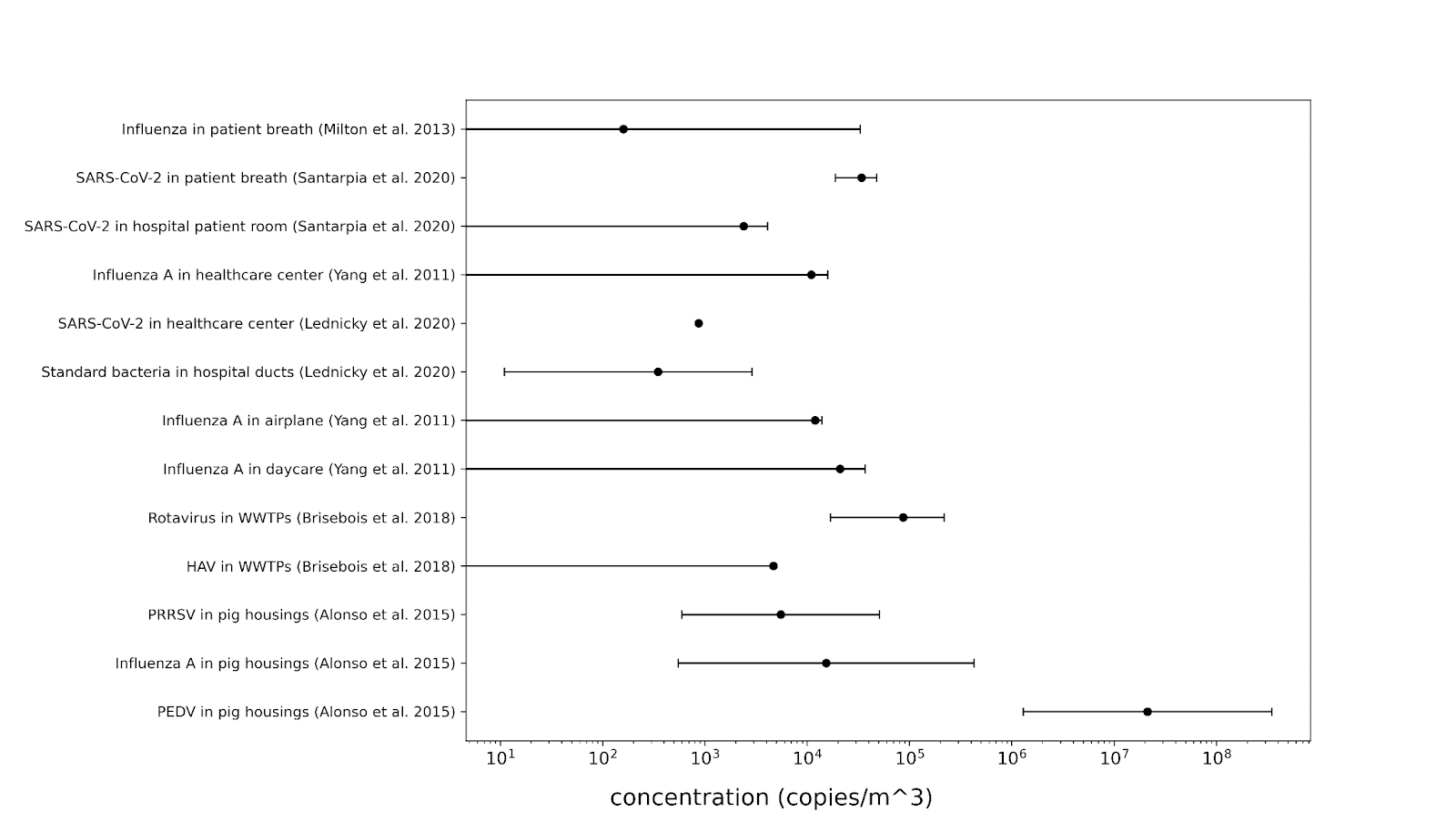 Air is generally a sparse medium for these particles. Typical indoor concentrations of VCPs and BCPs[4] are about 100 to 1000 particles per liter of air (4), while the count of individual pathogens, as measured by quantitative PCR (qPCR), often falls between 0.1 and 100 copies per liter, as shown in Appendix 2. For context, in January 2023, Biobot reported SARS-CoV-2 levels in Boston's wastewater at approximately 1 million copies per liter, with peaks reaching around 5 million copies per liter during the Omicron surge.