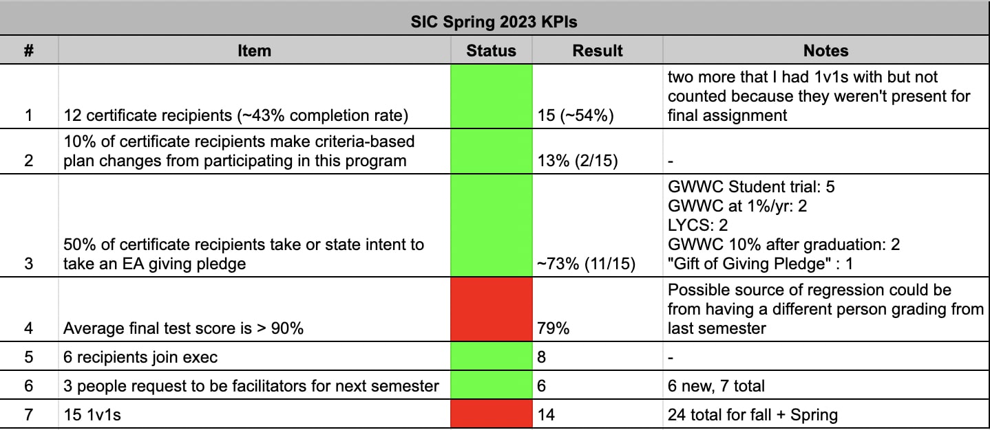 Feedback from the two semesters indicated the program was able to communicate core concepts of EA while achieving some success at upskilling participants. Depending mostly on organizer capacity and the target audience on campus, I believe some university groups should consider running this program or something similar instead of standard intro fellowships.