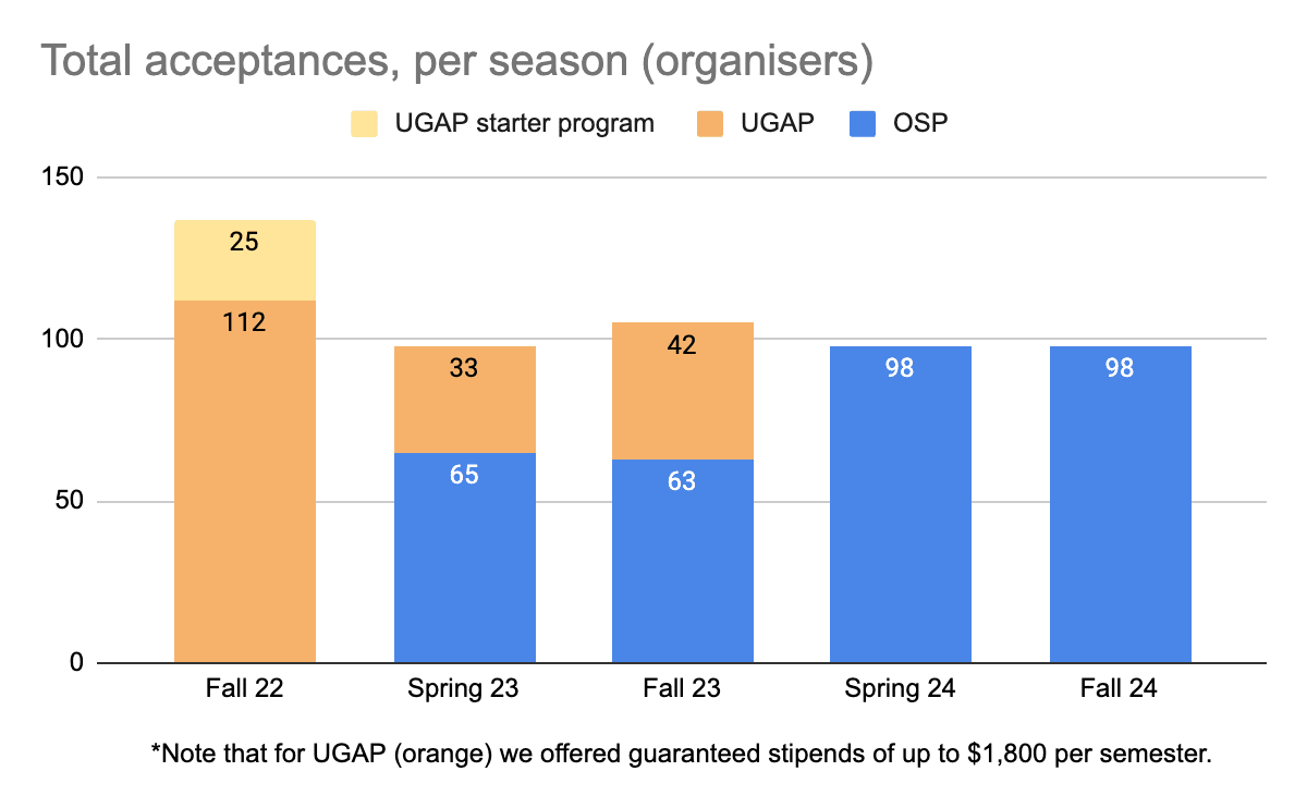 OSP supports both early-stage and experienced university groups. We previously offered a separate programme for early-stage groups, the University Group Accelerator Program (UGAP), but in late 2023 we merged the two programmes to reduce overhead.