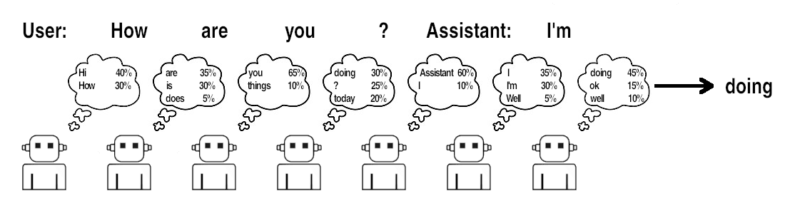 Sophisticated cutting-edge chatbots such as ChatGPT, Claude, and Gemini are powered by large language models of a decoder-only transformer architecture. This architecture is conducive to a use in general-purpose text prediction: it can be used to predict how any text will continue, one token (word in the AI’s vocabulary) at a time. Text prediction can be used to predict text in documents of many different styles. Chatbot LLMs are specially trained for predicting scripts for dialogues between users and helpful AI assistants.[2] Selective use of this ability can be leveraged to allow them to produce one side of a conversation.