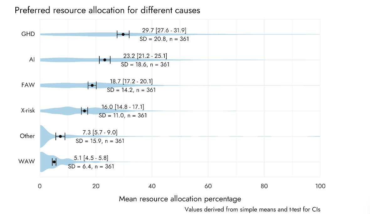 As far as survey data, I specifically had the response to Please give a rough indication of how much you think each of these causes should be prioritized by EAs. I took that wording to invite the respondent to divvy up the entire pie of EA resources. I would read them as suggesting that GHD > AW in the community's collective ideal cause prio, but by considerably less than donation numbers would imply. It's of course possible that the 2024 survey will show different outcomes.
