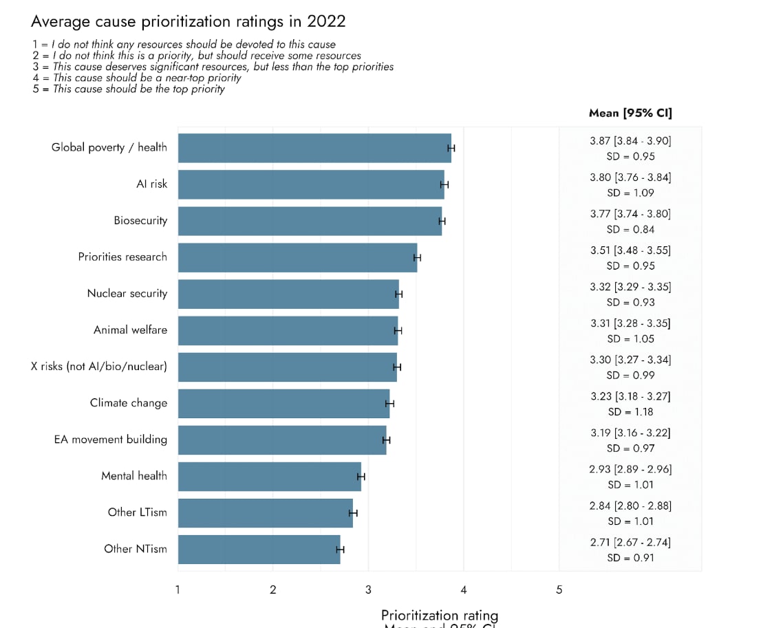 But the debate week question and the donation election were about marginal funding, which limits the breadth of the conclusions one can draw from those data. IIRC, many of the discussions -- and at least my own votes trending toward AW -- were heavily influenced by the small percentage of EA funding that is going into AW. Perhaps the EA Survey is the best sense of general community sentiment on the community's relative cause prio here?