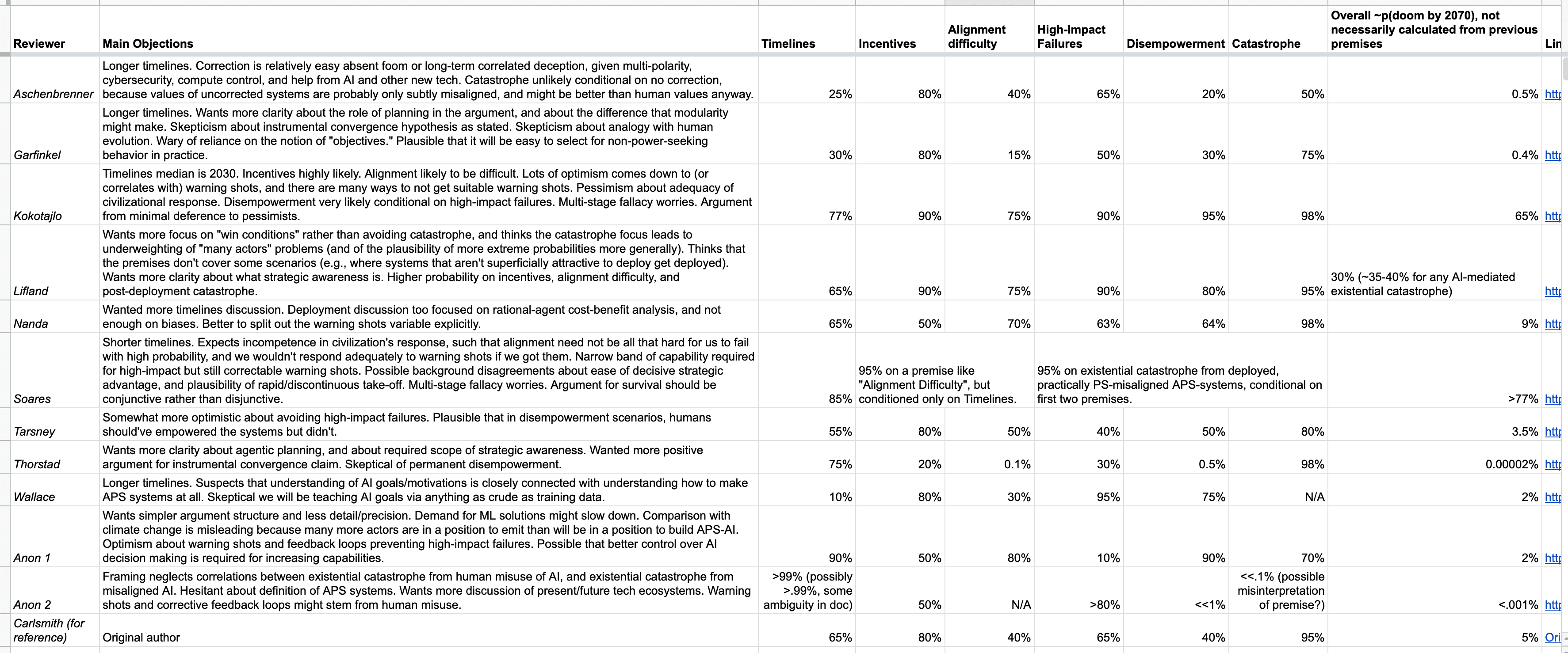 The table below (spreadsheet link here) summarizes each reviewer’s probabilities and key objections.