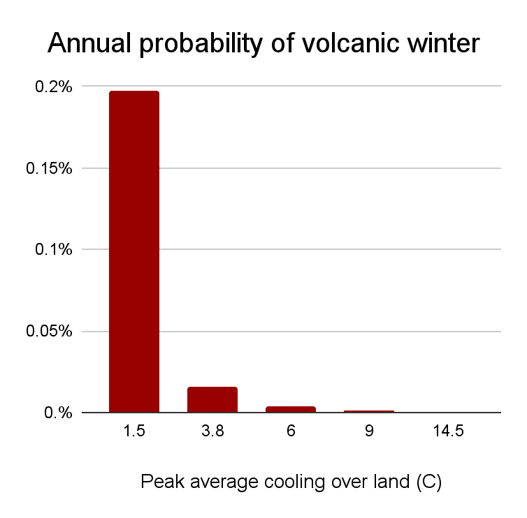 My model is a crude one, but it highlights the lack of more robust efforts to enumerate the risk of global volcanic cooling events. More work, by specialist researchers, is needed to better evaluate whether volcanic risk is worth taking more seriously.