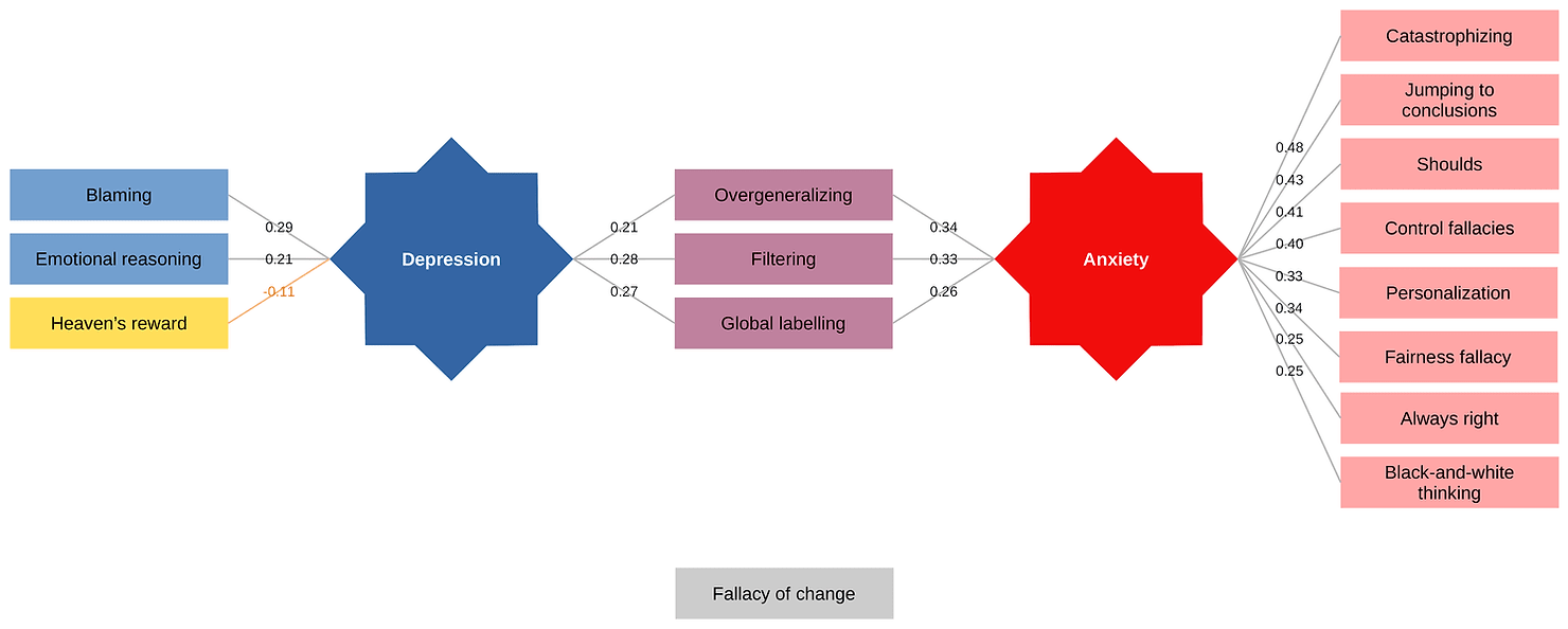 Cognitive distortions - In one of our studies, we investigated the link between mental health and common distortions in thinking, finding that (based on self-report of how often people engage in these patterns of thinking) some such distortions are associated with both anxiety and depression, such as overgeneralizing, filtering, and labeling. Other distortions, such as catastrophizing and jumping to conclusions, were associated with anxiety but not depression (when controlling for anxiety). Still, others, such as emotional reasoning and blaming, were associated with depression but not anxiety (when controlling for depression). These results are summarized in the diagram below!