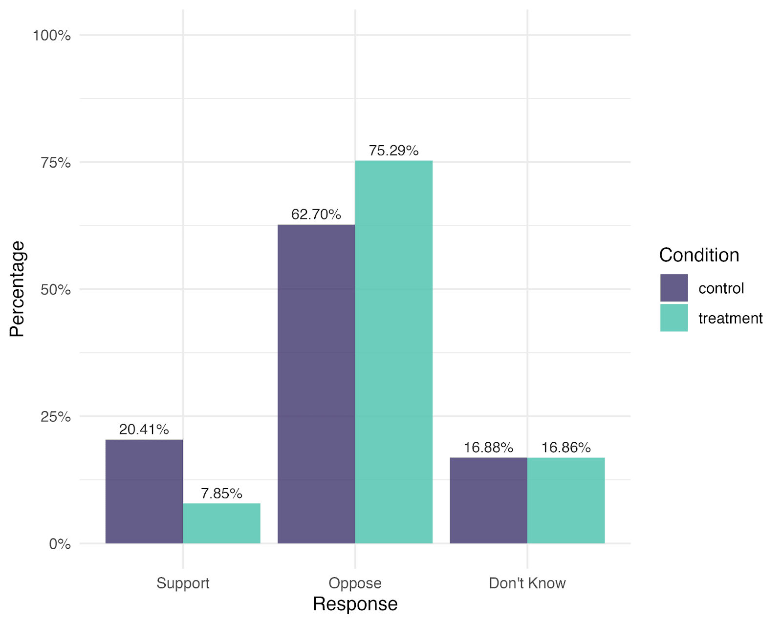 - In both the unweighted and weighted analyses, support was lower in the treatment condition than in the control condition. The share of “Don’t Know” respondents increased in the treatment in the unweighted analysis, while in the weighted analysis, the lost support seems to come directly from people choosing to oppose instead.