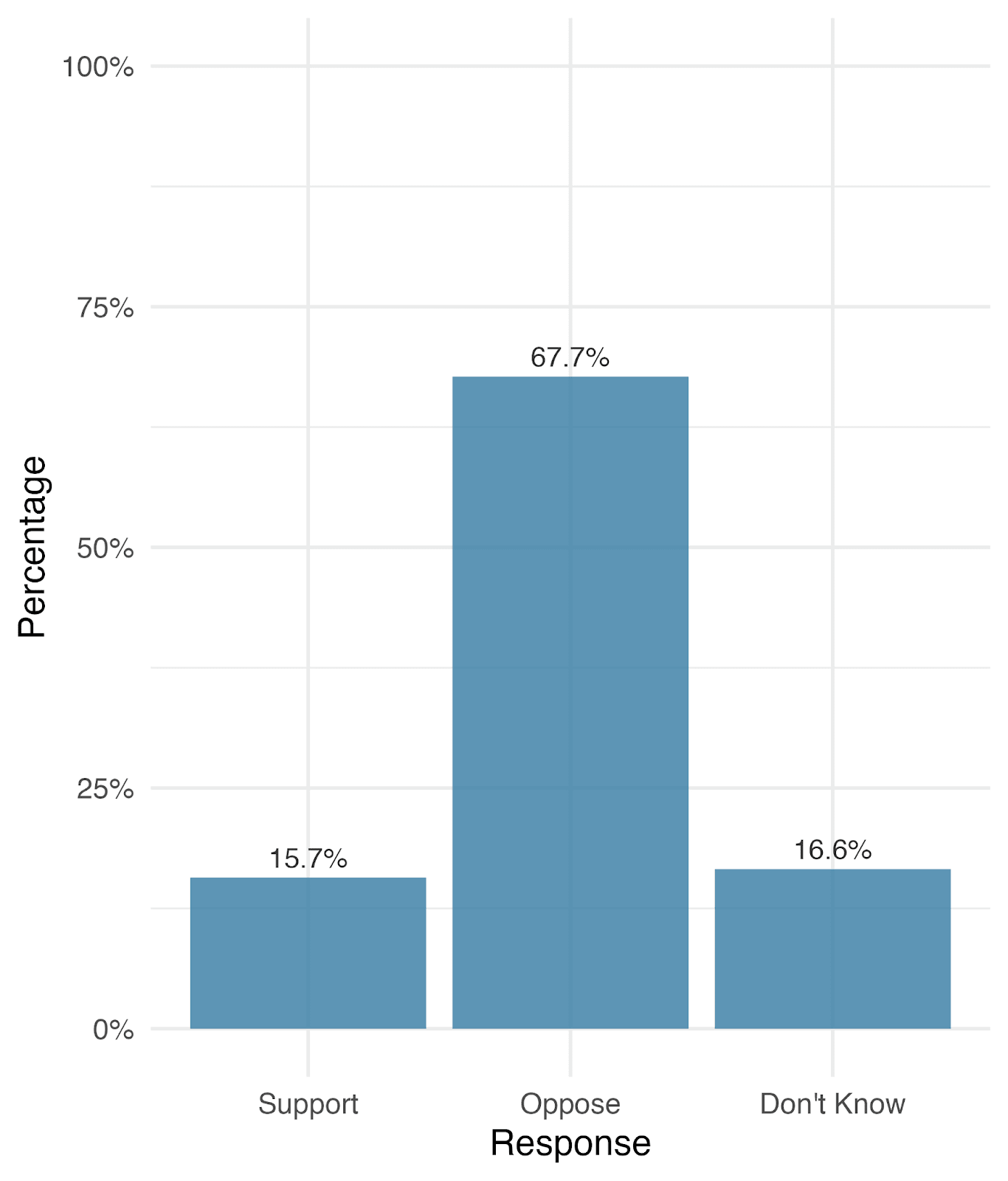 - We found 67.7% (95% CI [64.0%- 71.2%]) oppose, 16.6% (95% CI [13.9%-19.6%]) don’t know. (More results in the appendix.)