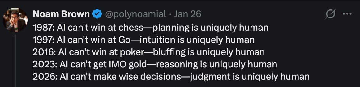 As of February 2026, AIs are currently better than the best humans at a narrow range of tasks (Chess, Go, Starcraft, weather forecasting). They are on par or almost on par with skilled professionals at many others (coding, answering PhD-level general knowledge questions, competition-level math, urban driving, some commercial art, writing1), and slightly worse than people at most tasks2.