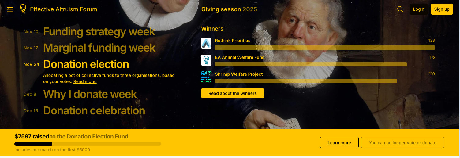 - Vote sniping (unsporting): We don’t want to see the ranking change drastically in the last few moments of the election, as voters tactically wait for the last minute to vote. This would mean far less time for the Forum to have mind-changing discussions. To avoid this, we aren’t sharing the deadline for voting. Votes will end at some point on December 7th[4].