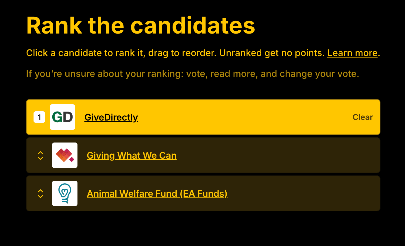 I found the voting interface to be very frustrating on mobile. In particular, when I was trying to select an org to promote to the next place in line, I was often swapping it with the org above or below it in line instead. The system assumed I wanted to vote for all organizations listed above the two swapped orgs in the order of their listing, which was annoying.