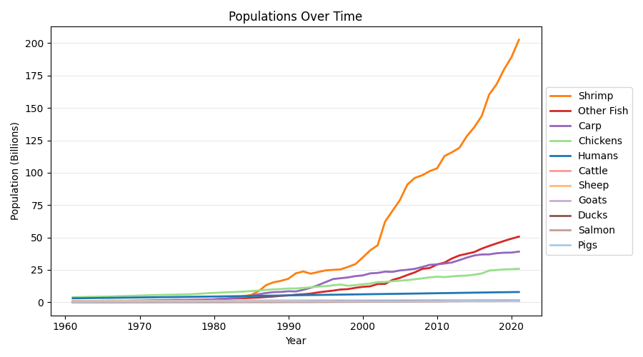 Shrimp, fish, and chickens presently dominate by total population. However, this is a relatively recent phenomenon. In 1961, humans outnumbered all animals except for chickens, and even chickens only outnumbered humans by less than a billion individuals. Now, as of 2021, there are > 4x as many farmed chickens as humans, and more than an order of magnitude more farmed fish and shrimp.