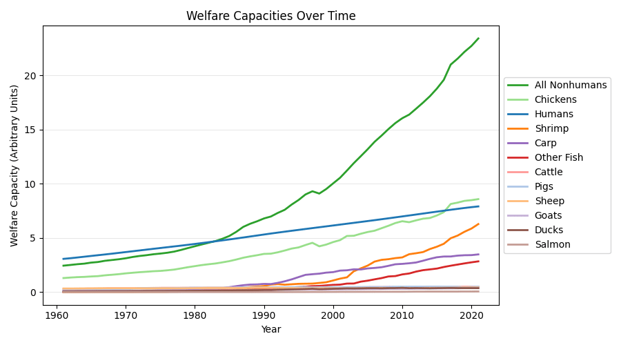 Next, I multiplied annual population numbers by the estimated welfare ranges of each species to get the total capacity for welfare of each species over time. For species for which welfare range estimates have not been rigorously generated, I made conservative estimates based on the ranges of other species. In addition to the annual welfare capacities for each individual species, I also calculated the total welfare capacity of all non-human animals.