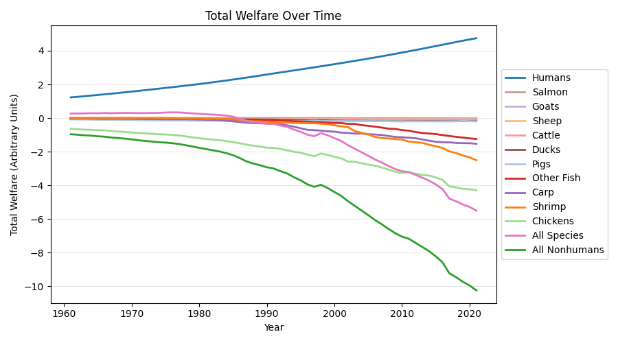 I’ve used human and farmed animal population data, estimates of welfare ranges across different species, and estimates of the average wellbeing of different species to get a rough sense of recent trends in total global welfare. Importantly, this initial analysis is limited to humans and some of the most abundant farmed animals—it does not consider effects on insects or wild animals, the inclusion of which could plausibly change the top-line conclusions (see e.g. here). I focus on the years from 1961-2021, as this is the period for which the most reliable data exists, and the period most relevant to understanding the current trajectory.