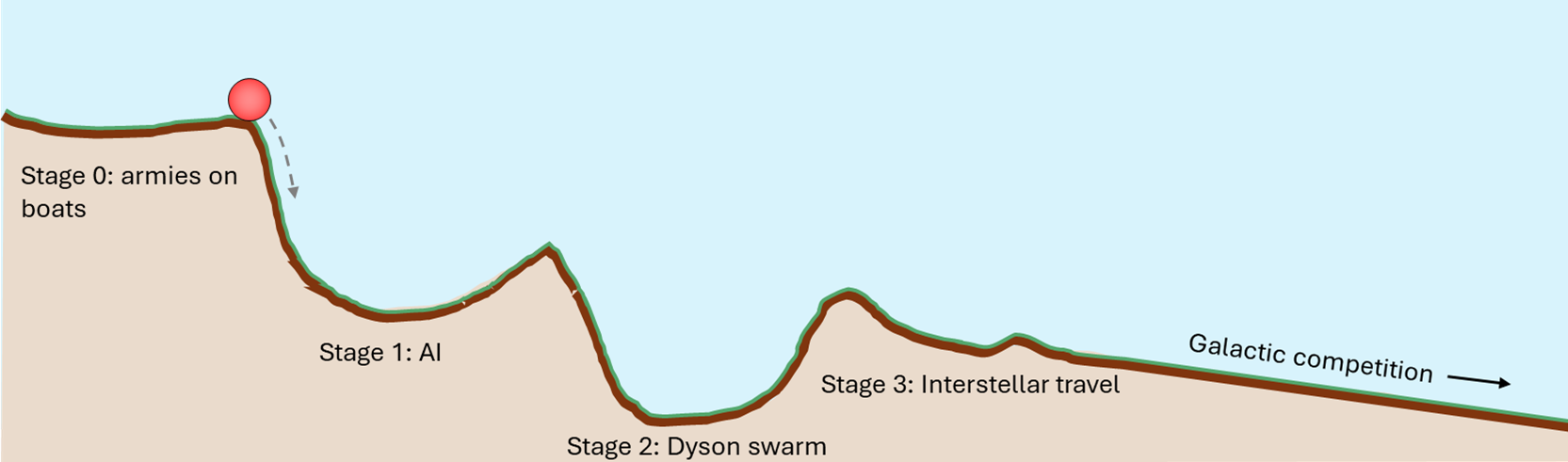 So, my overall take on the 3 stages of competition for the long-term future is that stage 1 is in full swing, and it's not clear that one actor will gain global dominance. If stage 2 begins, which I think could happen any time in the next 5 to 20 years, then the race could continue to outer space. I think the long-term future might be ~70% determined in stage 1, ~30% determined in stage 2, and rounding error determined in stage 3. Lock-in is not necessarily bad, and these stages also represent opportunities to influence the long-term future and decide on values for a galactic civilisation. If we pass through all of them without doing that, then we end up with the default pathway to galactic colonisation, which I will discuss next.