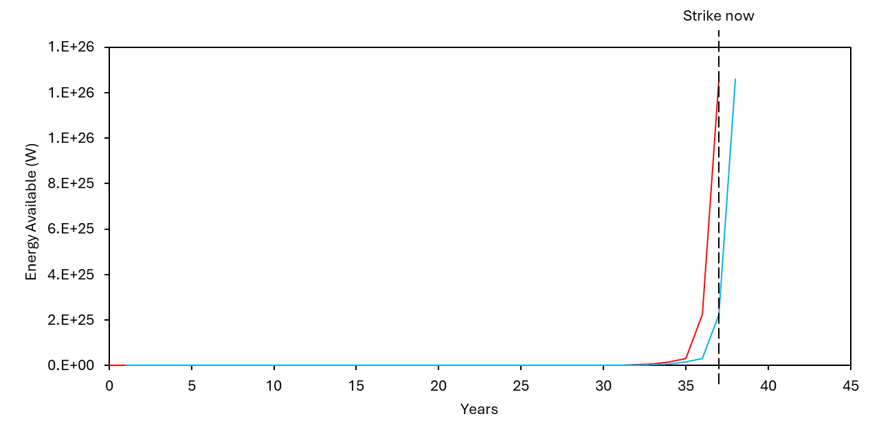 This results in a huge power imbalance near the end of construction, where the first mover has ~5x as much energy after ~36 years. The first mover could leverage this advantage to destroy the second mover. It's unclear exactly how, but if you have that much energy, you'd have a lot of options, including lasers and kinetic missiles.