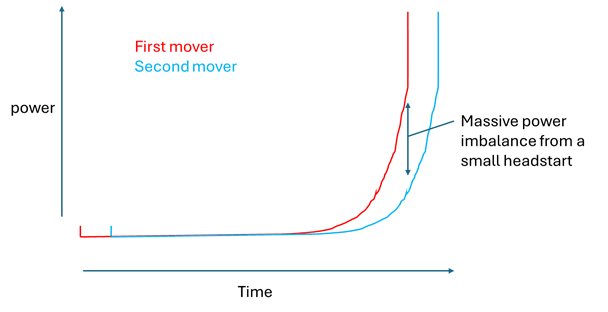 - After a while, one of those asteroid mining companies begins using the space resources to construct solar panels, which they use to power further resource collection. With that, they initiate a positive feedback loop on energy and resource collection with a lead on everyone else of about 5 years due to their resource claims and existing infrastructure[26].