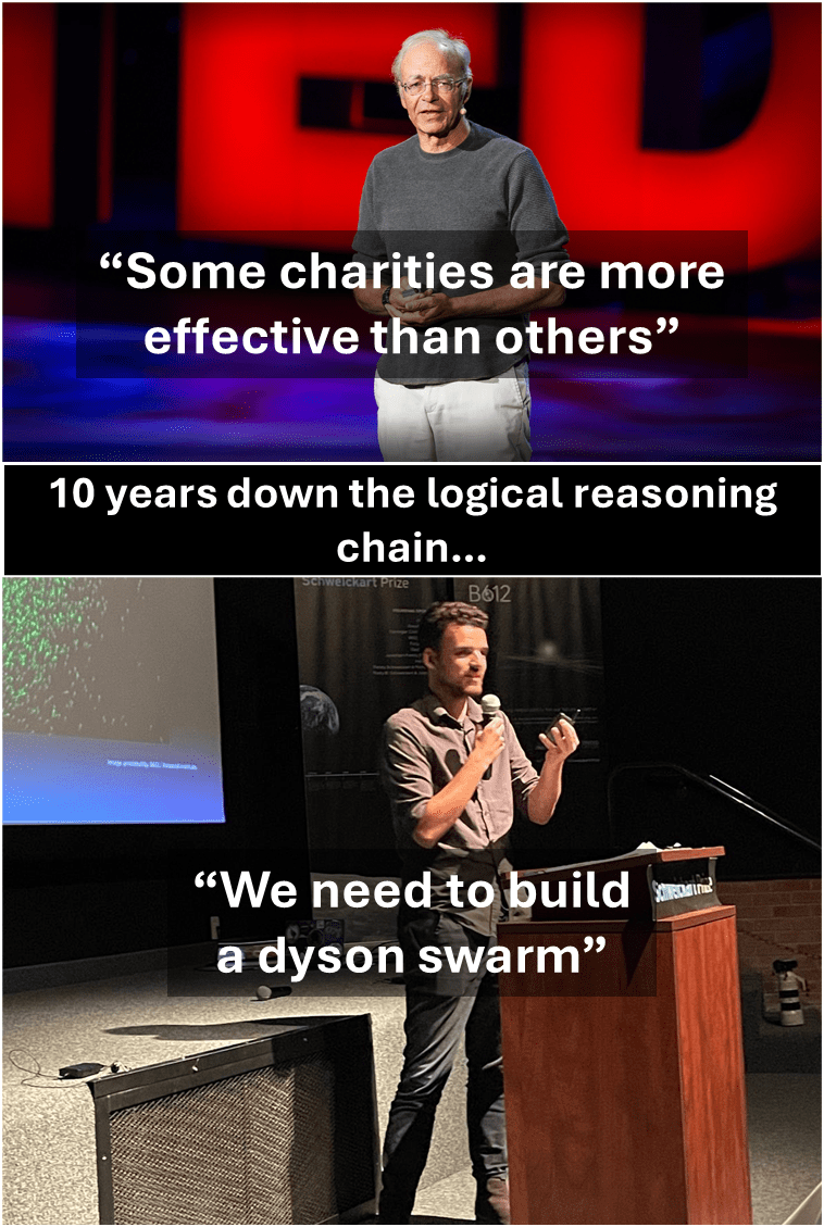If competition for Dyson swarm construction is a game of chess, the pieces are already moving: Google is working on Project Suncatcher, Sam Altman is chatting about Dyson swarms, Elon owns a space company, an AI company, and a solar panel company, and is discussing building thousands of solar-powered AI satellites. Building a Dyson swarm is currently legal. Dyson swarms are extremely important for the long-term future and they can't really be ignored by the longtermism and large scale space ethics communities anymore. One actor cannot be allowed to decide what to do with the long-term trajectory of human civilisation - that's a decision for all of humanity, or, at least, everyone who cares about that sort of thing.