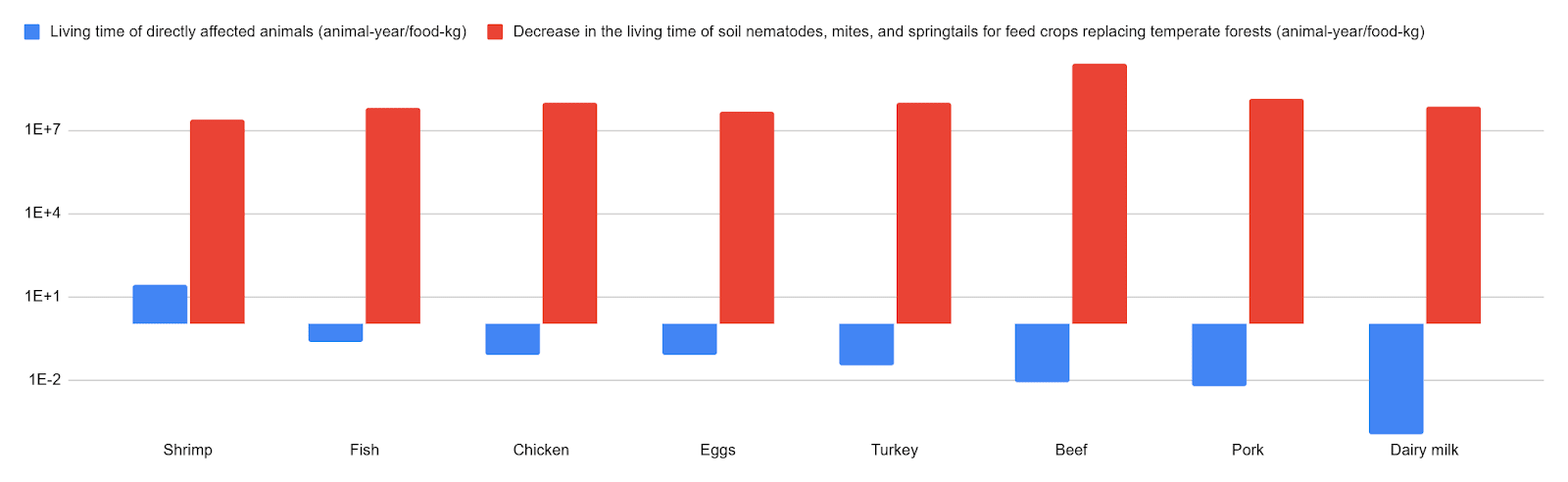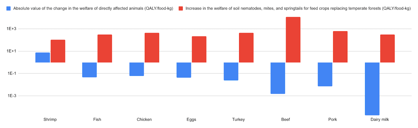 I estimate animal farming increases the welfare of soil nematodes, mites, and springtails hugely more than it changes that of directly affected animals. For example, I conclude 0.1 kg of chicken meat decreases the welfare of directly affected animals by 0.00593 QALYs, but increases that of soil nematodes, mites, and springtails by 28.5 QALYs for feed crops replacing temperate grasslands, savannas, and shrublands, which is 4.81 k times as many QALYs. For that land use change, among the 8 animal-based foods below, the increase in the welfare of soil nematodes, mites, and springtails ranges from 9.39 (shrimp) to 11.7 M (dairy milk) times the absolute value of the change in the welfare of directly affected animals.