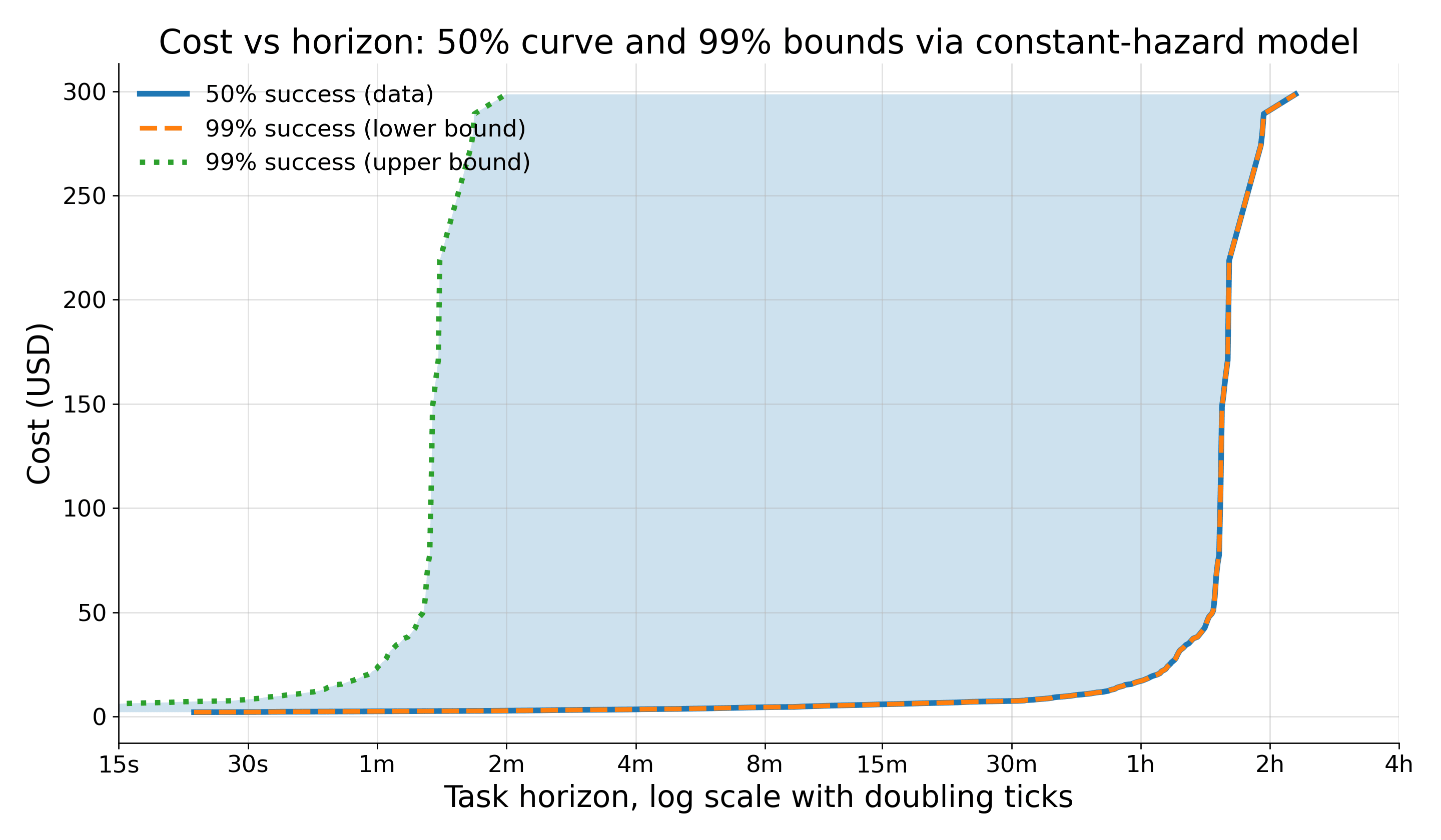 Thanks Basil! That's an interesting idea. The constant hazard rate model is just comparing two uses of the same model over different task lengths, so if using that to work out the 99% time horizon, it should cost 1/70th as much ($1.43). Over time, I think these 99% tasks should rise in cost in roughly the same way as the 50%-horizon ones (as they are both increasing in length in proportion). But estimating how that will change in practice is especially dicey as there is too little data.