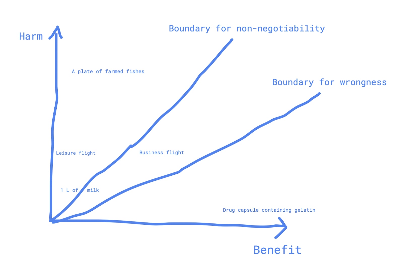 A third problem for this constraint is to find a theoretical justification for the location of the boundary. It’s difficult to find an argument to justify at what point harm to animals becomes non-negotiable. I’m personally less concerned by this problem.