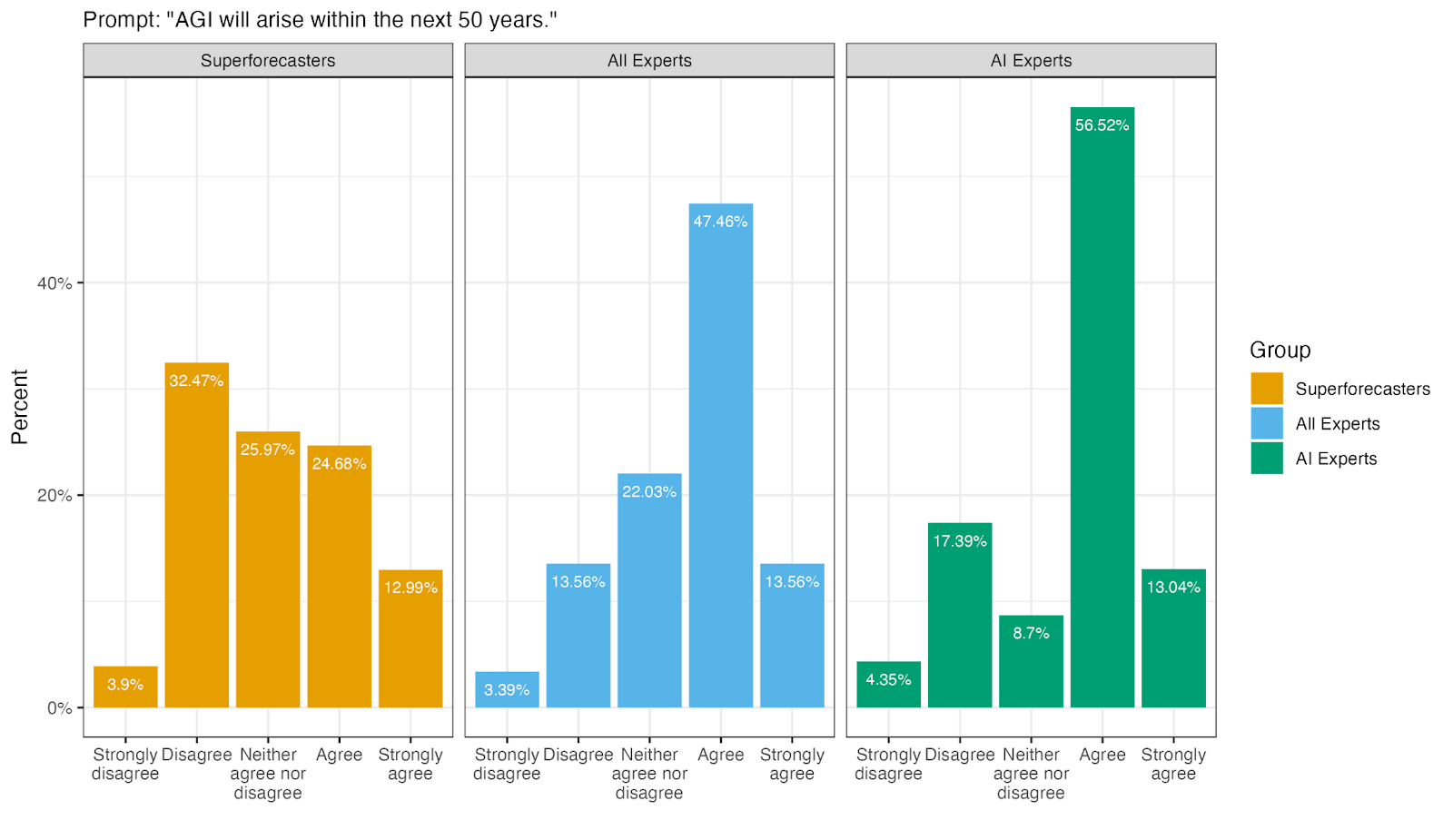 - ~26% of superforecasters predicted AGI by 2070 as 50% likely or more, but ~38% agree or strongly agree that AGI will arise by the end of 2072. ~36% of experts predicted AGI by 2070 as 50% likely or more, but ~61% agree or strongly agree that AGI will arise by the end of 2072.