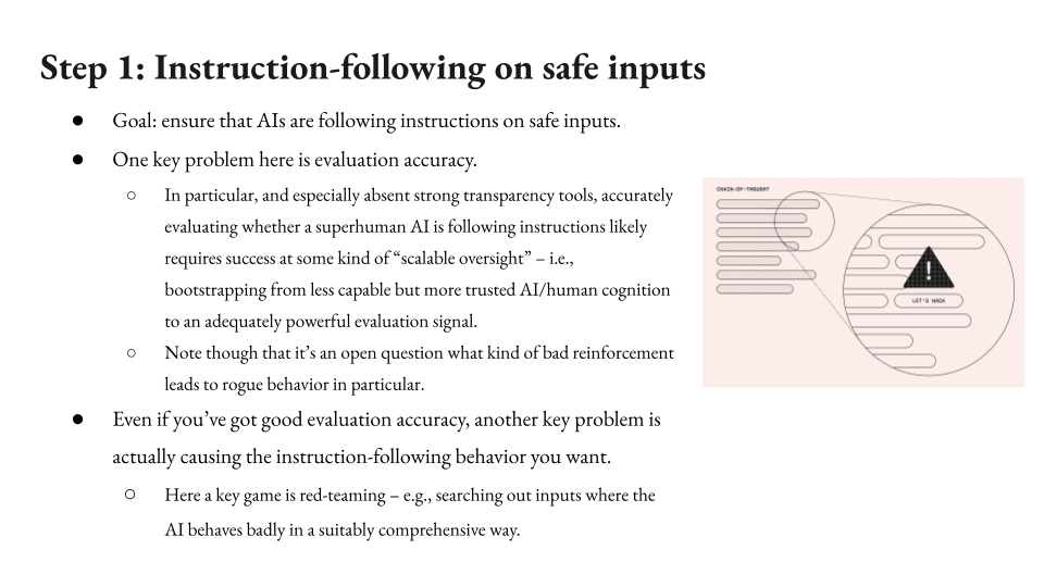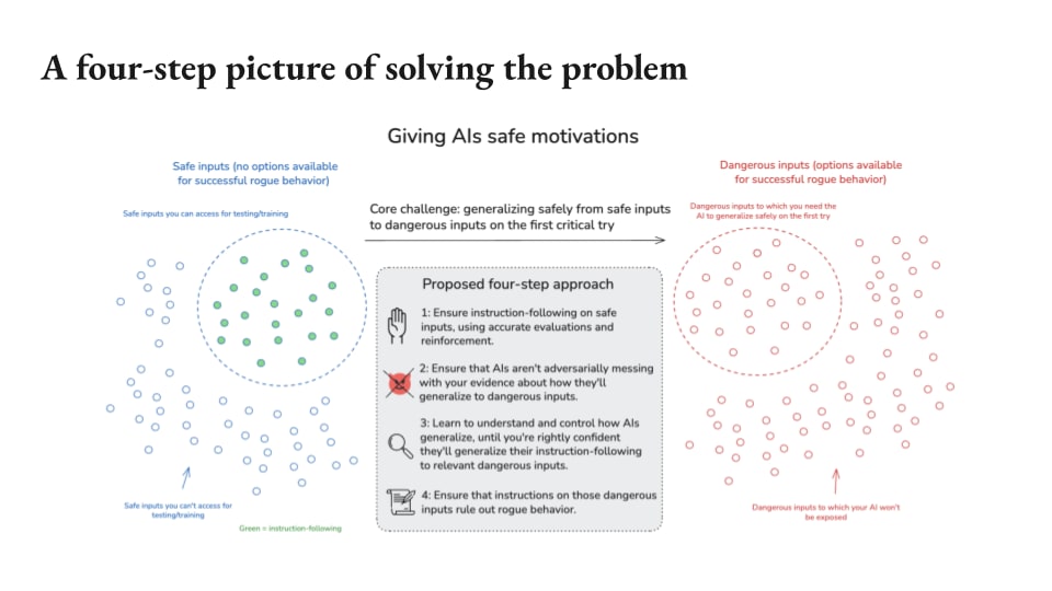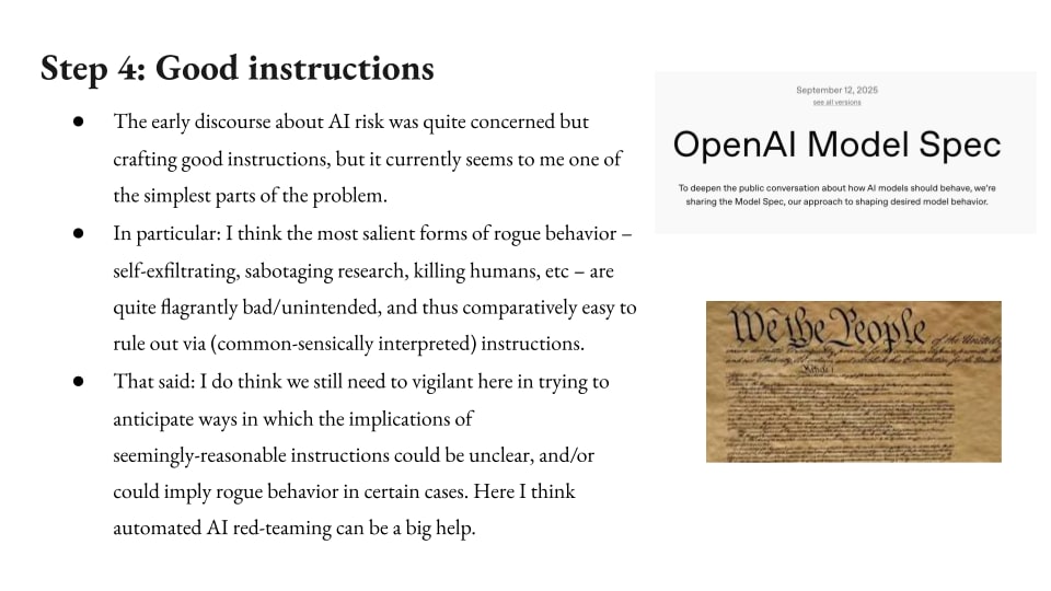 And so that said, there are some edge cases that are tough. Maybe we need to think about things like manipulation. Maybe there's extreme circumstances we didn't anticipate where even common-sensically interpreted instructions lead to rogue behavior. So people need to red team that, anticipate those dynamics. And I think they should use AI to help. And if you have AIs that are going to follow instructions even on dangerous inputs, then you've got a lot of juice in terms of the AI labor you might be able to mobilize for getting this last step right. So that's step four, that's the full picture.