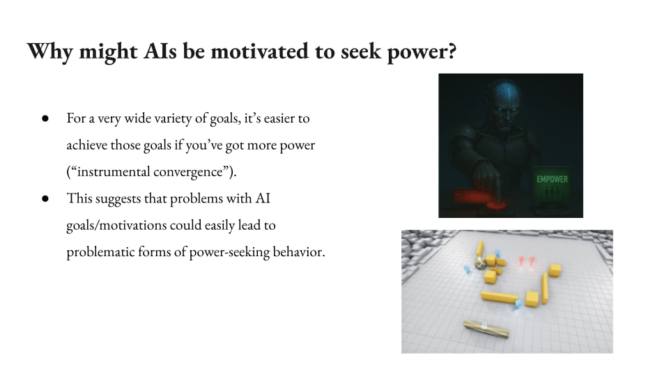 Okay, let's talk about the second premise. Okay, so suppose we have these systems that are in a position to choose to disempower humanity. Why would they do that? That's a very specific thing to do. They could do all sorts of things. Well, it's maybe not that specific thing. It's maybe something that you might expect by default for lots of different types of agents. And the reason is that for a very wide variety of goals, it's easier to achieve those goals if you've got more power.