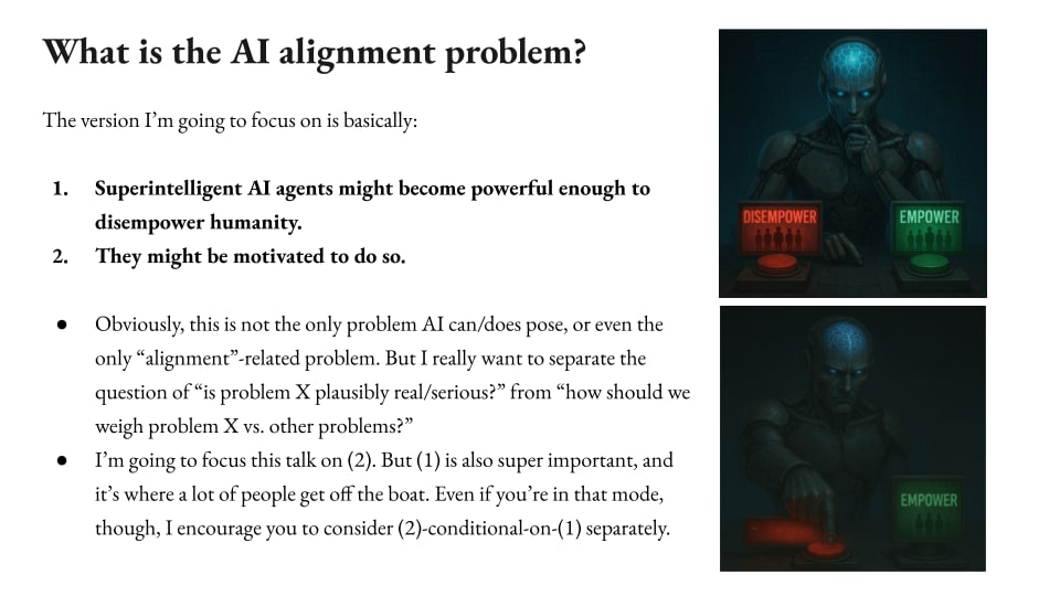 Okay, so with that said, what is the AI alignment problem? Well, the version I'm going to focus on, I'm going to frame using two core claims. The first is that superintelligent AI agents might become powerful enough to disempower humanity. There's going to be a live option, there's a course of action these agents could pursue, it's within their capabilities to pursue such that all humans would end up permanently and involuntarily disempowered.