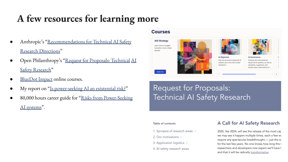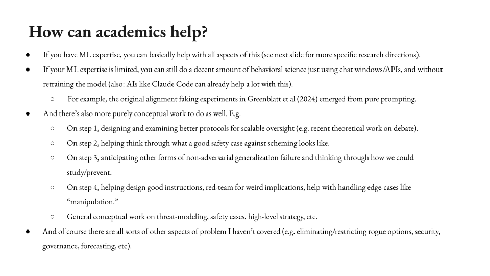 And I'll just end here with how can academics, like the folks in this room, help? Well, if you have ML expertise, then you can basically help with all of this. I'm linking in the next slide to some resources that have a bunch of technical research directions you can pursue. So if you're comfortable with a reasonably full stack of retraining ML systems and doing empirical experiments, there's just a ton of work to be done. If your expertise is limited, you can still do, in my opinion, a decent amount of behavioral science just using chat windows/APIs and without retraining the model.