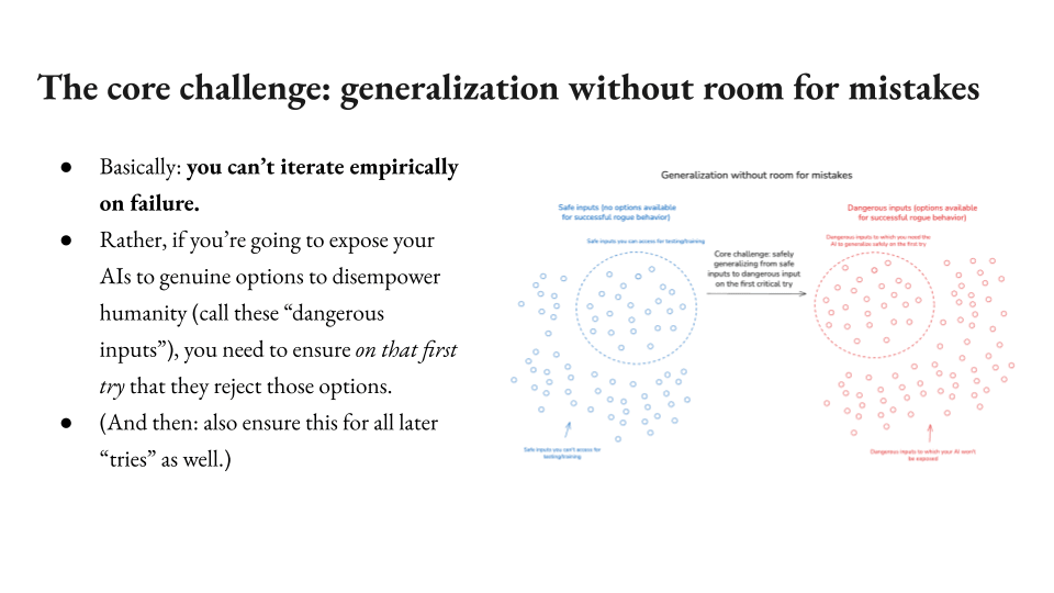 A: Yeah. And then I heard a different thing, which is you're sort of skeptical about the generalization about room for mistakes where I guess I'm not yet seeing how... So we've been at this [slide on "The core challenge: generalization without room for mistakes"], do you reject? Or I guess the specific thing here, it's not necessarily it's unprecedented, it's that if you want to not be disempowered in the relevant sense, then by the time AI is deployed on options where it has a reasonable chance of disempowering you, it needs to reject those options. So you need to get that right.