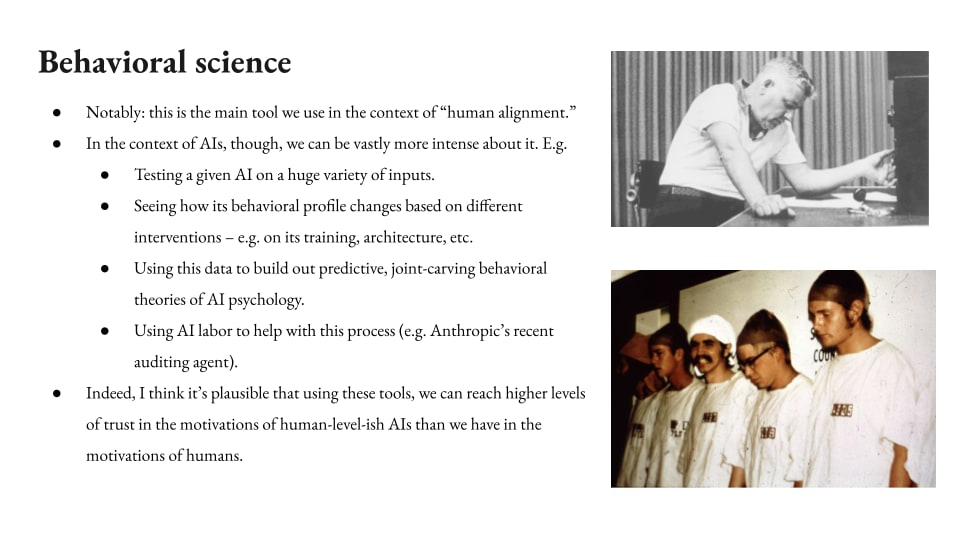 Now obviously, humans, we might not be comfortable giving them the option to disempower humanity or take over the world either. In fact, I think we shouldn't. But I want to distinguish between the question of is the problem that the AIs are AIs as opposed to humans and the separate problem of any agent reach having the option to disempower humanity? And I think we might be able to at least reach the level of trust that we have in humans via behavioral science.