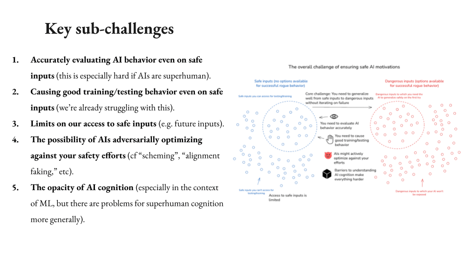 So now, that said, I think there's a few other sub-challenges that make this problem hard. So one is that accurately evaluating AI behavior even on the safe inputs gets difficult when the AIs—I mean, it's difficult period for various reasons, but it's especially difficult when the AI are superhuman because the humans might not be able to understand the relevant behavior, there might be scarcity of oversight. A bunch of ways in which evaluating superhuman AI behavior might be harder than usual. So you might not even know what's going on as much as you'd like, even on the safe inputs.